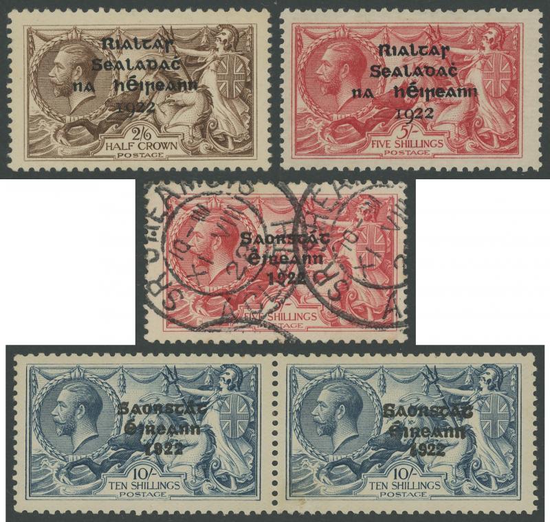 1922-28 Overprints on Great Britain KGV Seahorses predominantly mint selection including Dollard 2/6d x2, 5/- x2 & 10/-, Thom Four-Line 2/6d & 5/- and Three-Line set, Harrison Narrow Date set plus 2/6d & 5/- used and Wide Date set in singles & horizontal pairs plus blocks of 4 of 2/6d & 5/-, then Re-Engraved set plus 2/6d & 5/- used, also 1937 St Patrick 'es' Wmk set and 'e' Wmk range, etc, a few with some minor gum aging otherwise generally fine to very fine, Cat £4900+.