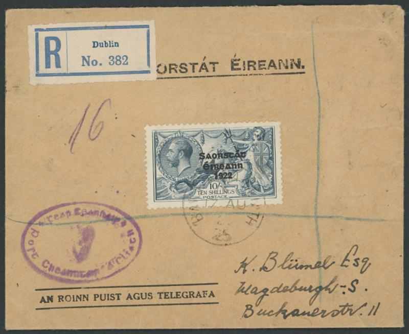 POSTAL HISTORY: 1926 (Aug 17) 'SAORSTAT EIREANN' Post Office cover to Germany with very fine & well-centred 10/- Seahorse SG 66 (Cat £375 x3+ on cover) tied by 'BAILE ATHA CLIATH' cds, blue/white 'Dublin' R label, 'MANDEBURG/19.8.26' arrival backstamp. (Image1)