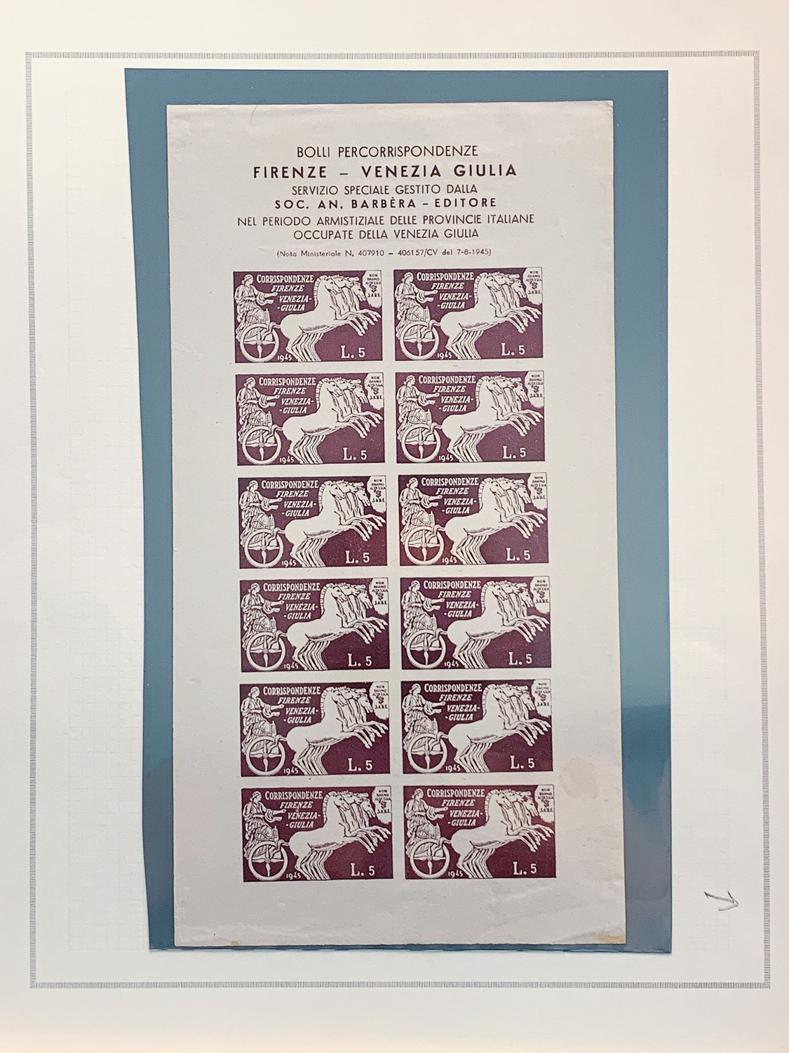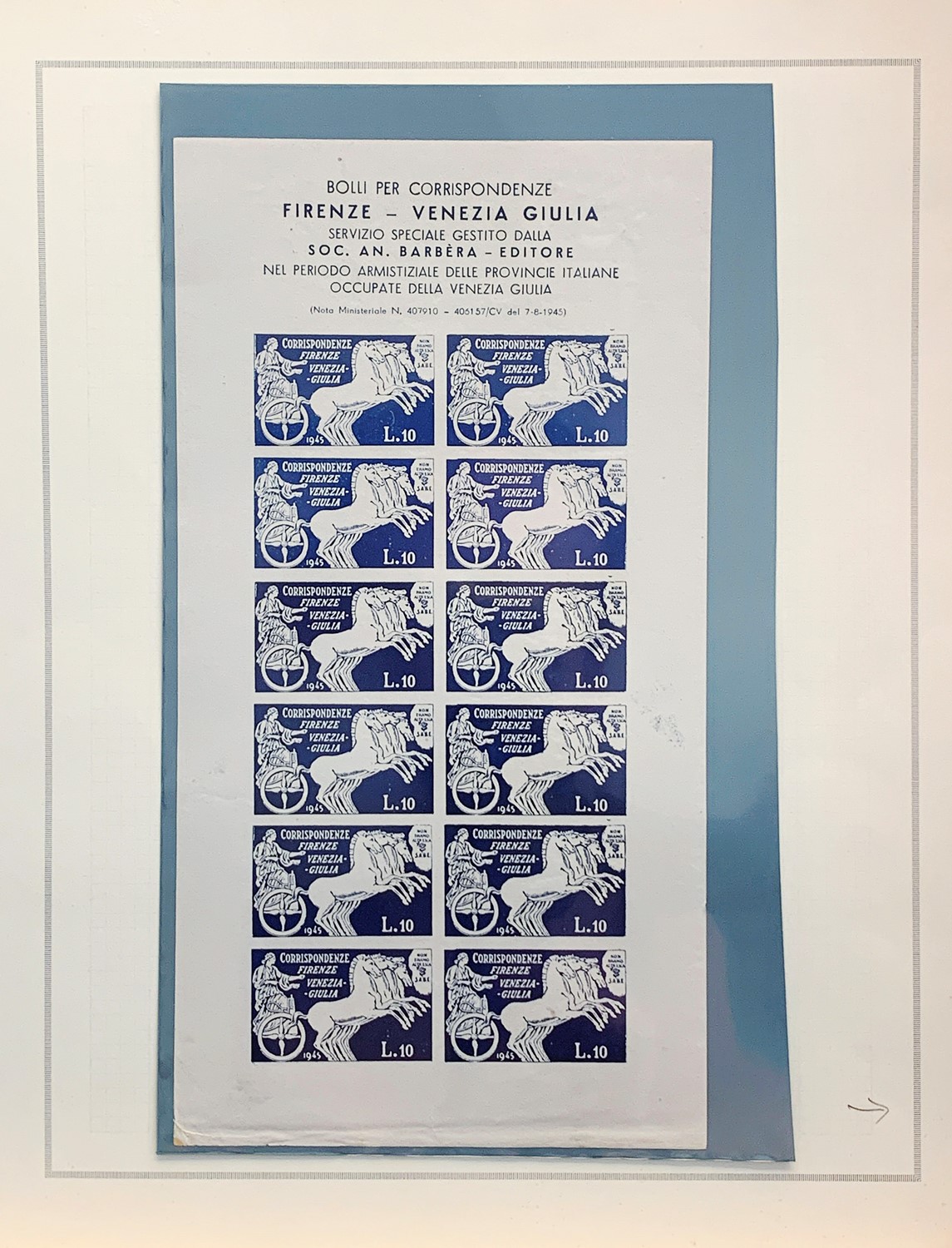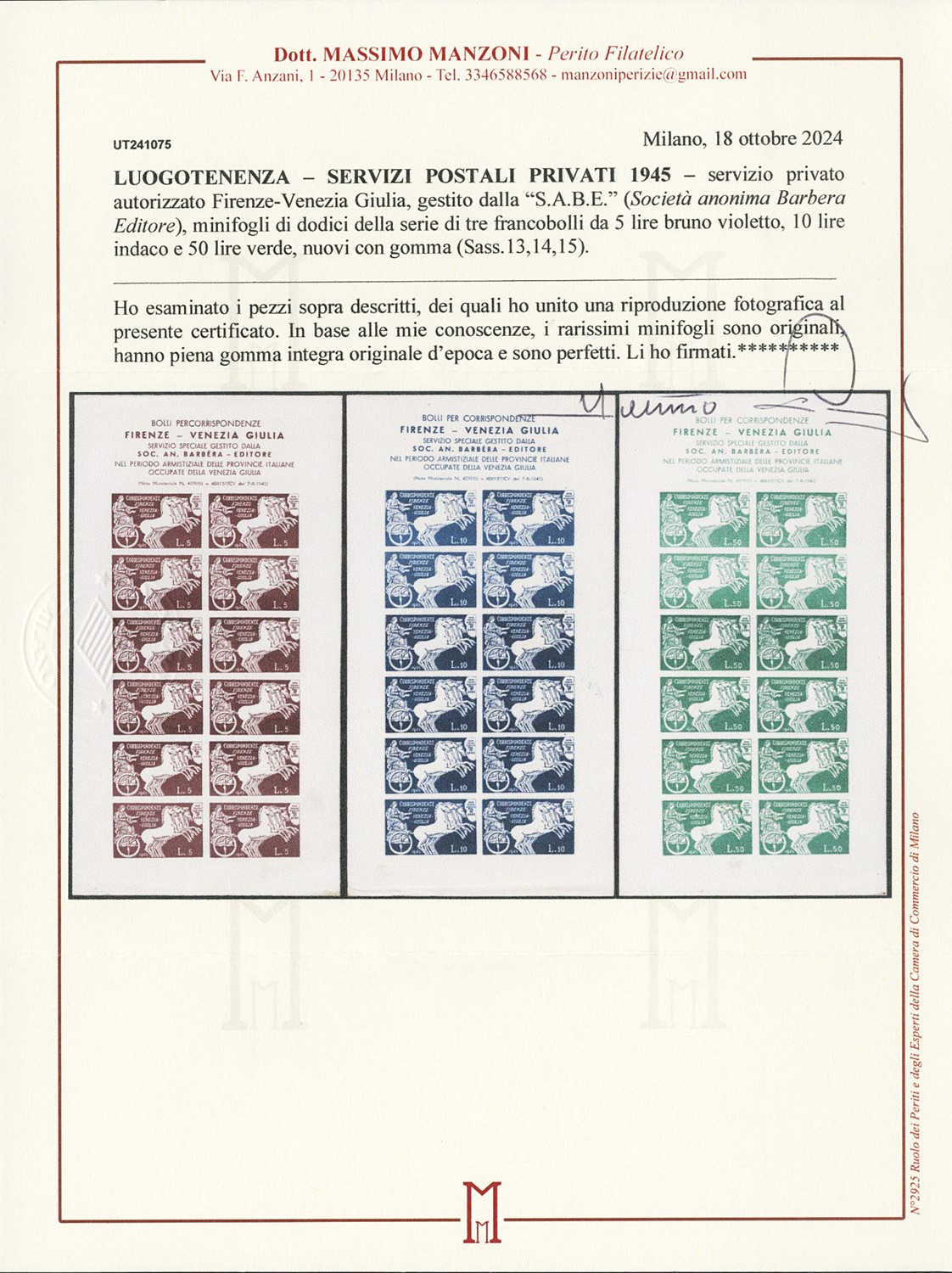 1945 - S.A.B.E. la serie di tre valori in minifogli da 12 esemplari SL. Rarissima, CF Manzoni (Sassone 13/15 minifogli - Euro 34.500)1945 - S.A.B.E. the complete set of three denominations in miniature sheets of 12 copies, MNH. Extremely rare. CF Manzoni (Sassone 13/15 minifogli - Euro 34.500)(Image 1)