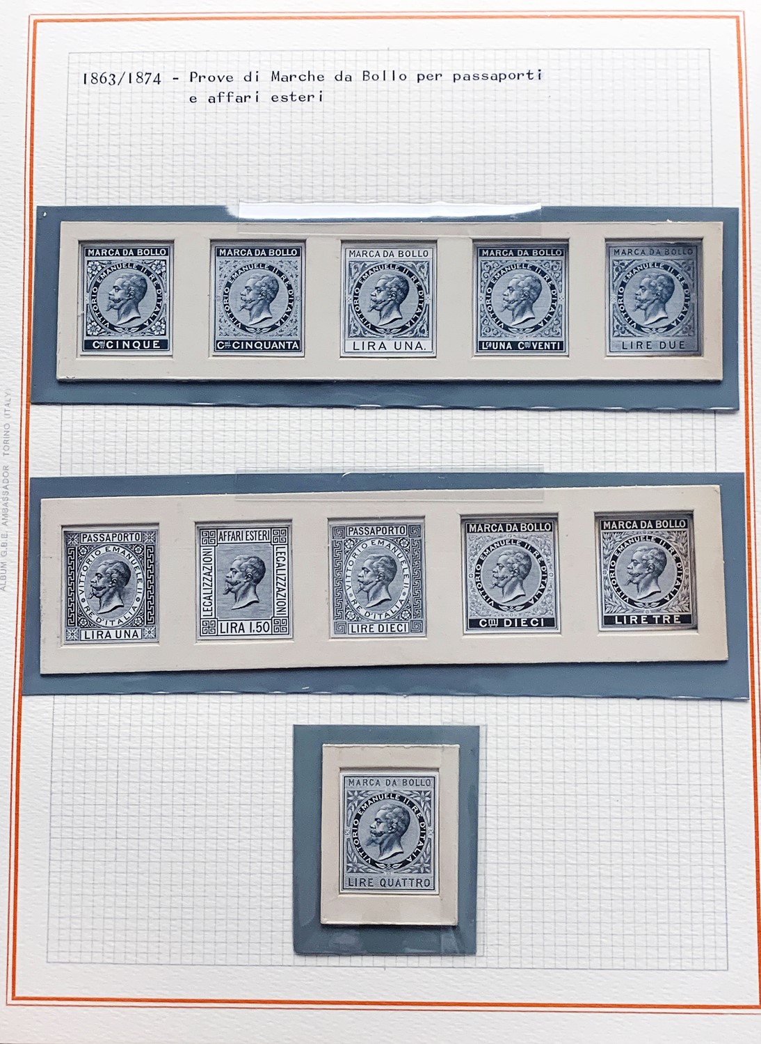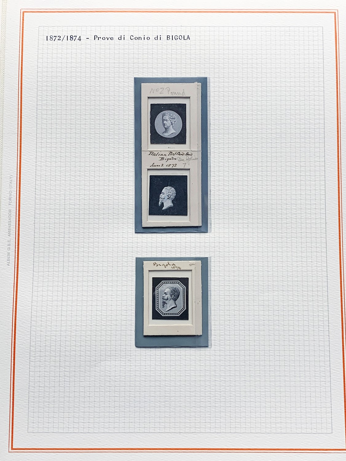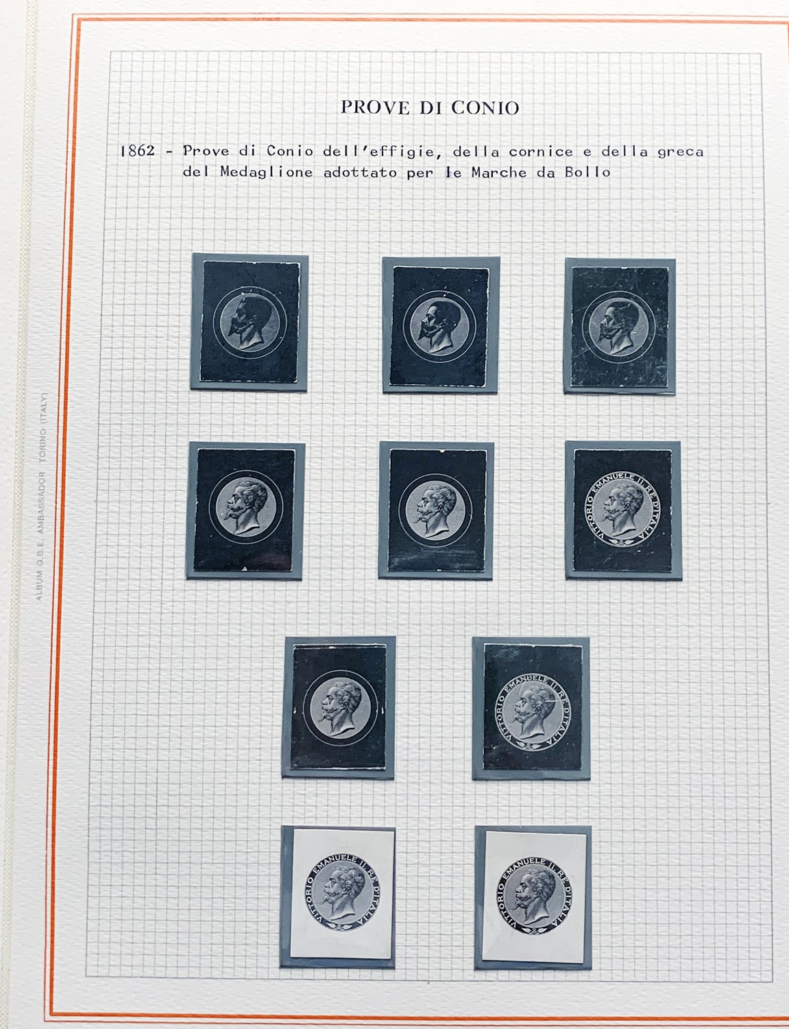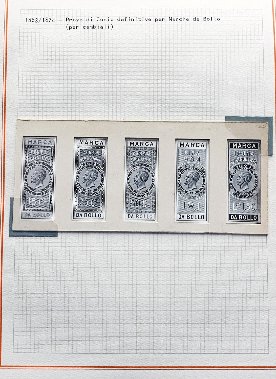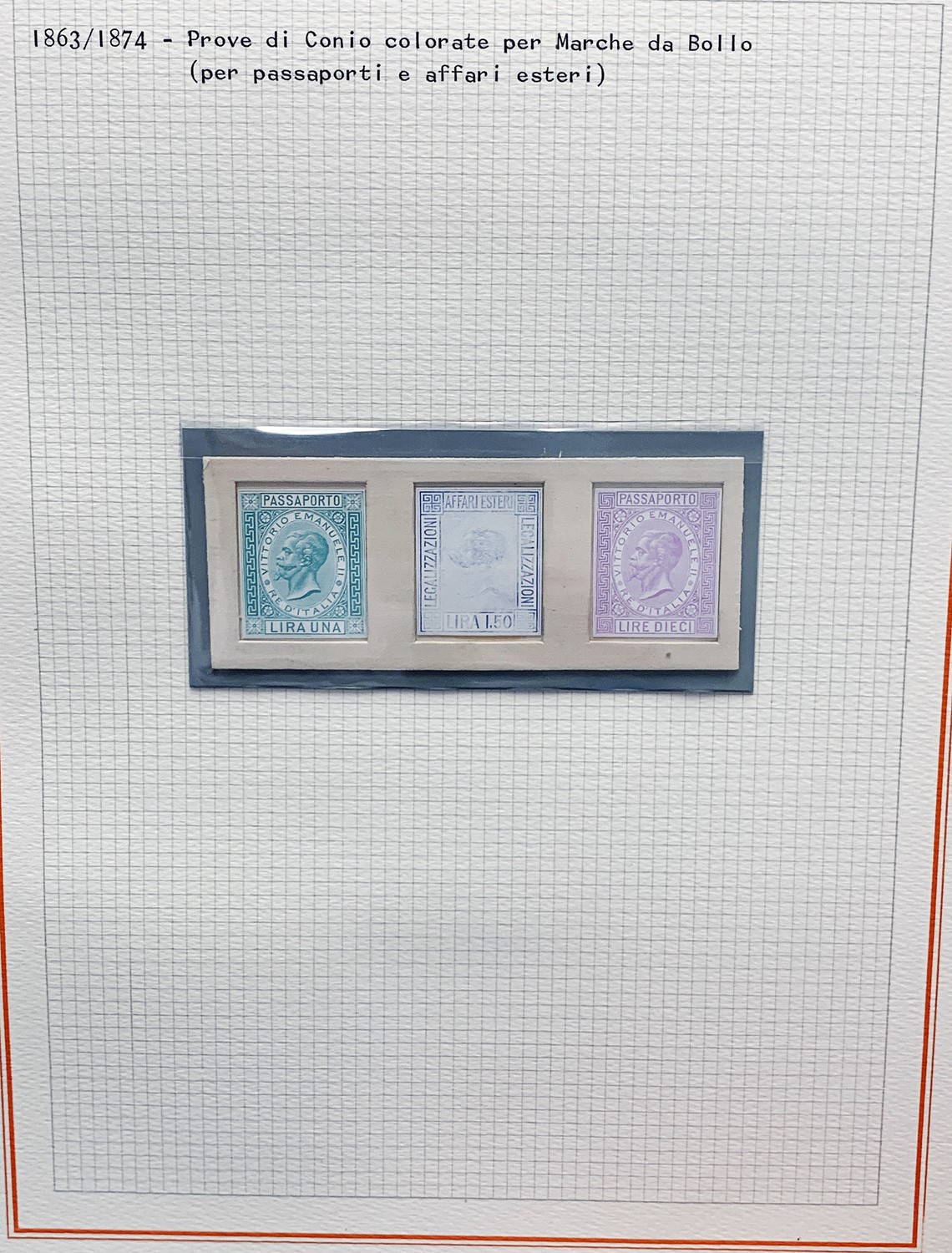 1860/74 - REGNO D'ITALIA - PROVE E SAGGI PER FRANCOBOLLI E FISCALI: interessantissima collezione del settore, montata su fogli Bolaffi, comprendente prove Sparre (3), Pellas (10), Ronchi (8), Coucourde (3c), Wentch (4), Ronchi etichette (8), Re (7), altre ignote (34); prove di conio su cartoncino Bigola (3 grandi), 2L DLR, altre Prove di conio su cartoncino (31) e prove per passaporti (36). Insieme irripetibile di grande qualità