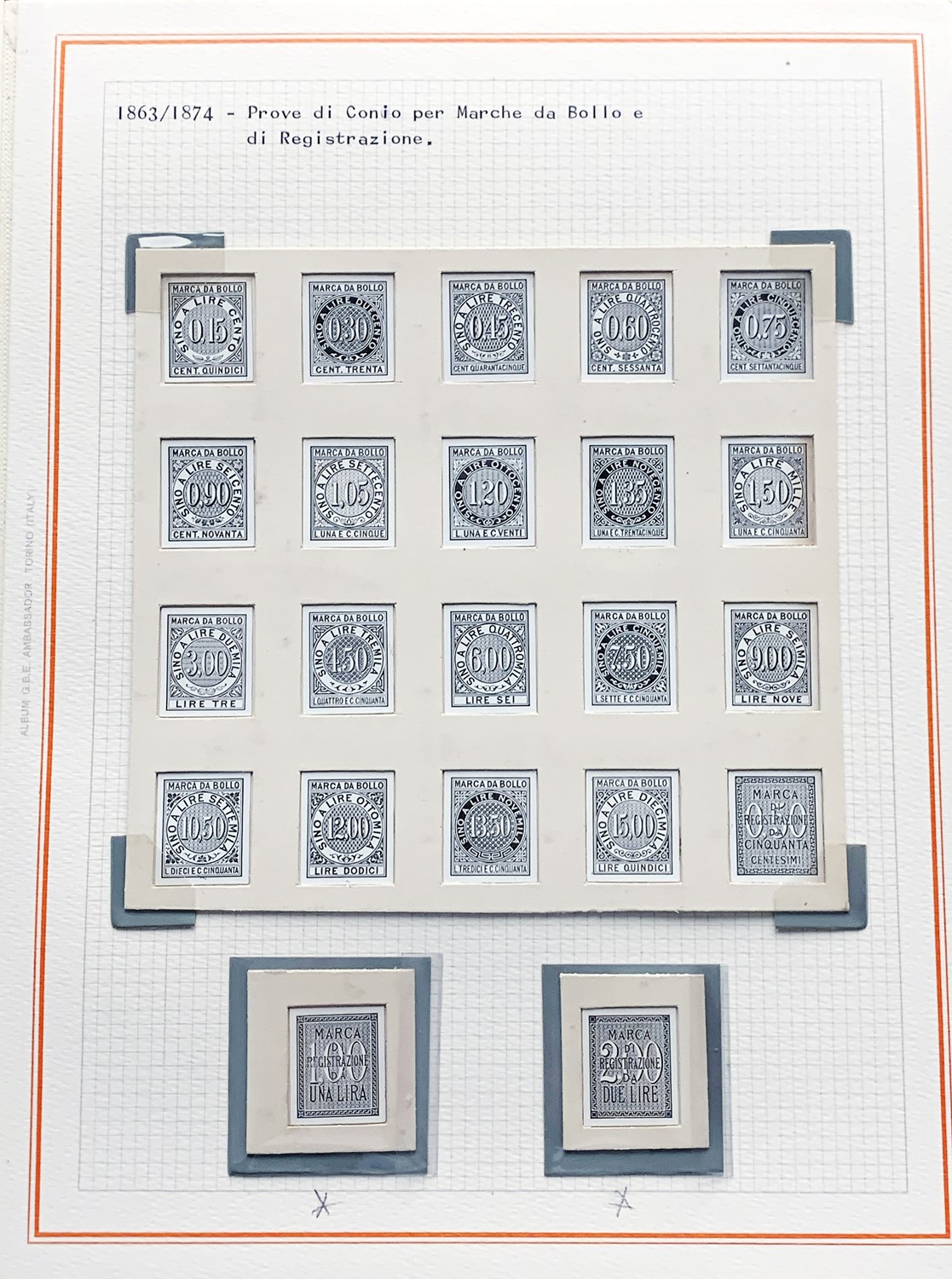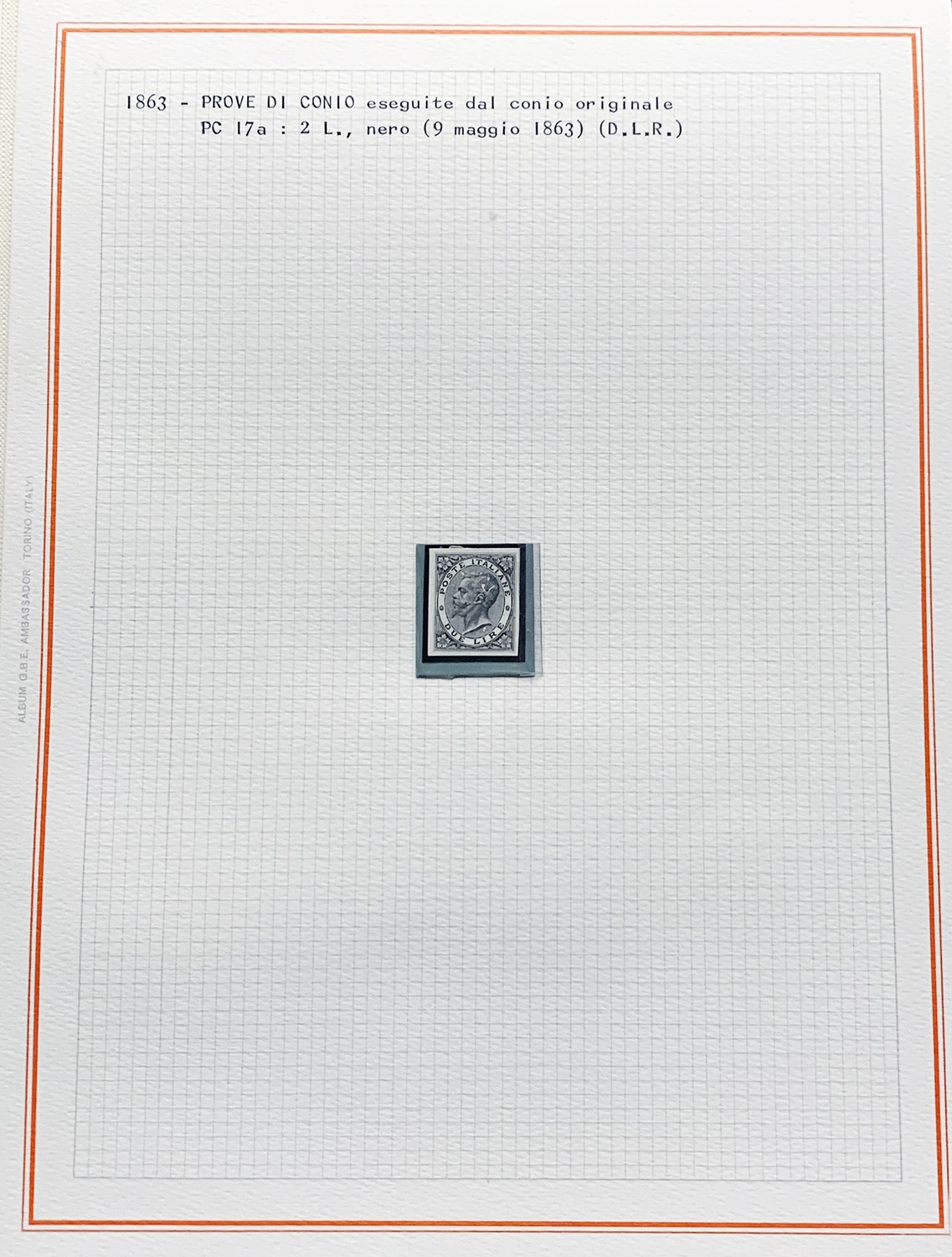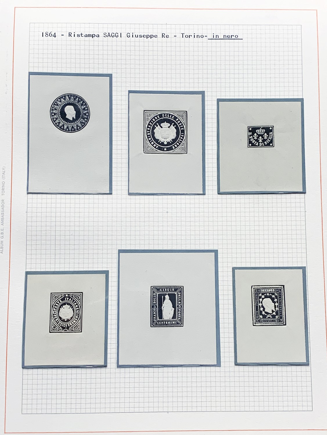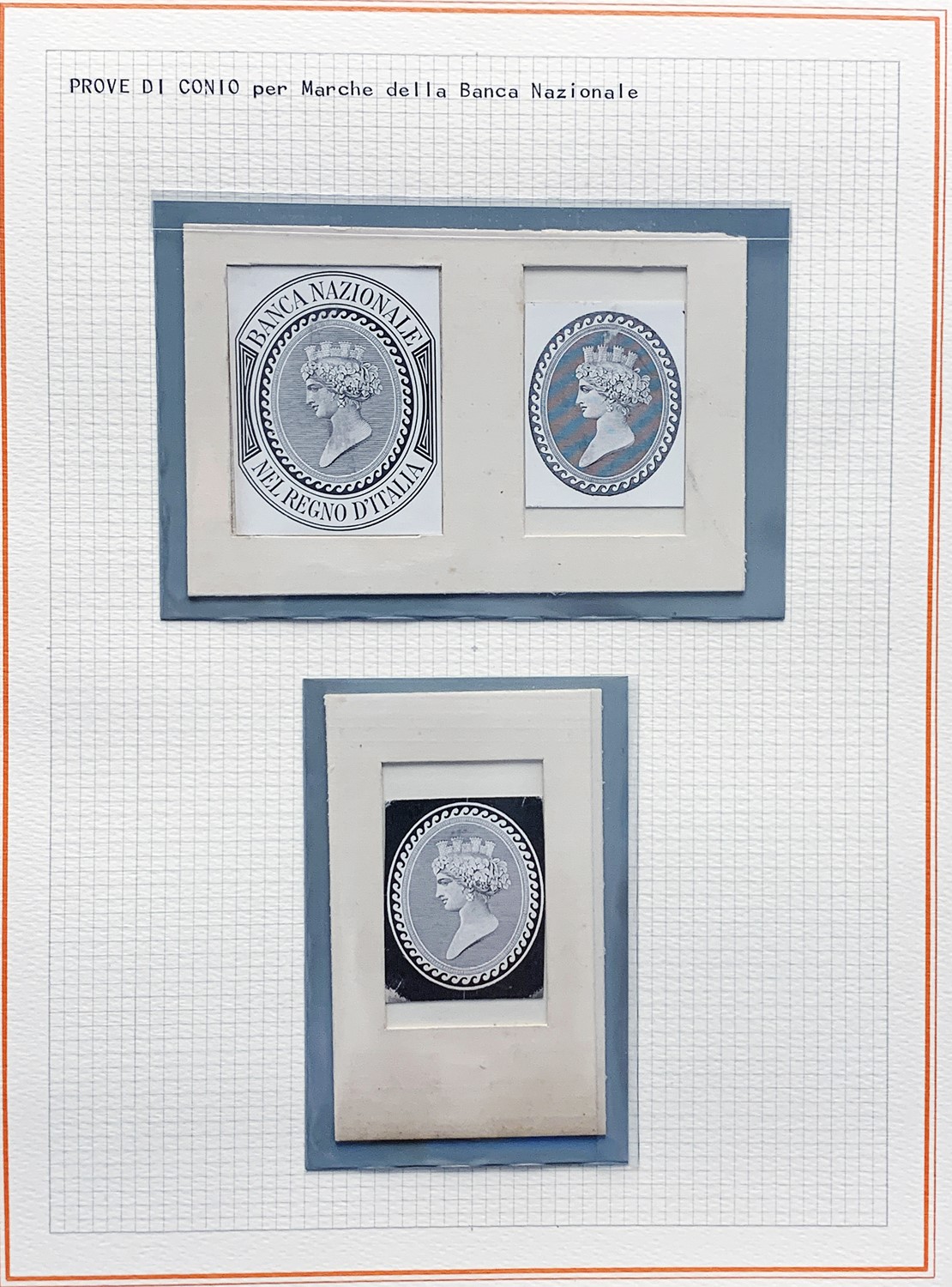 1860/74 - REGNO D'ITALIA - PROVE E SAGGI PER FRANCOBOLLI E FISCALI: interessantissima collezione del settore, montata su fogli Bolaffi, comprendente prove Sparre (3), Pellas (10), Ronchi (8), Coucourde (3c), Wentch (4), Ronchi etichette (8), Re (7), altre ignote (34); prove di conio su cartoncino Bigola (3 grandi), 2L DLR, altre Prove di conio su cartoncino (31) e prove per passaporti (36). Insieme irripetibile di grande qualità