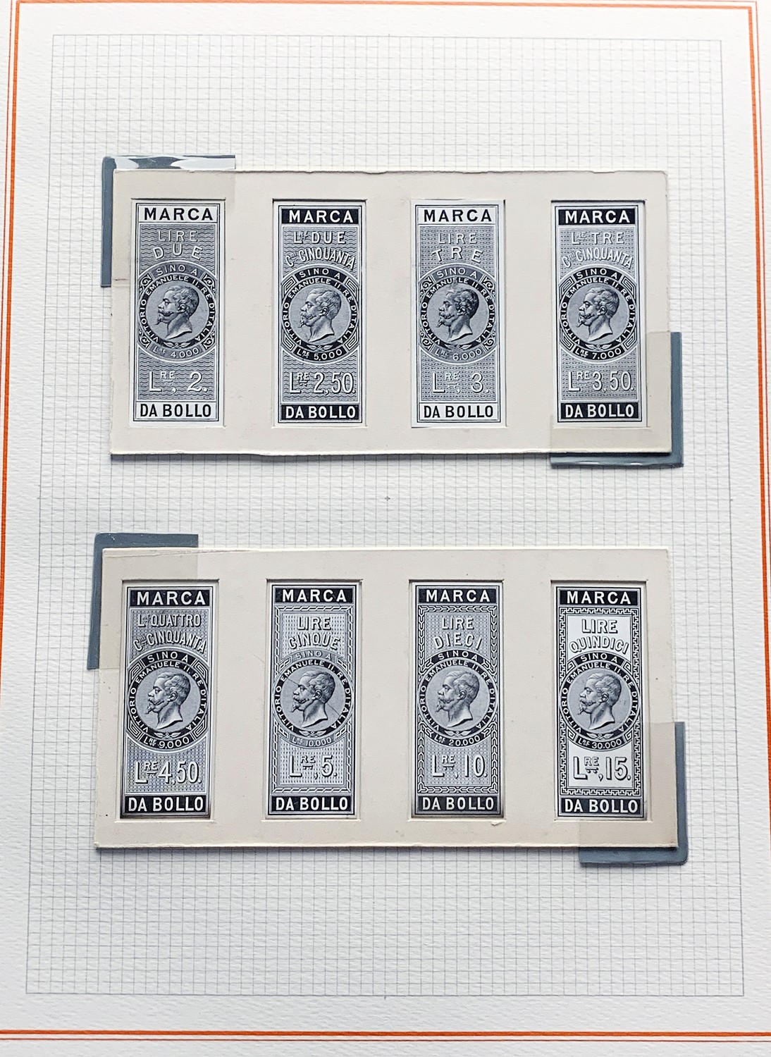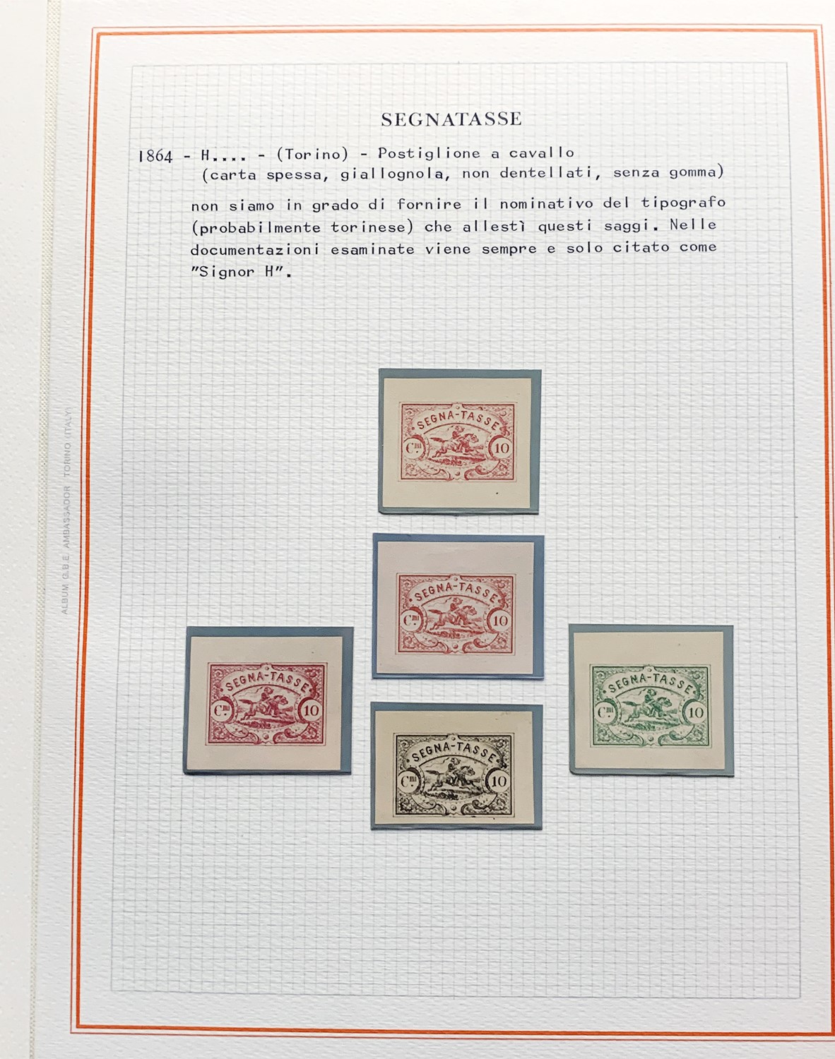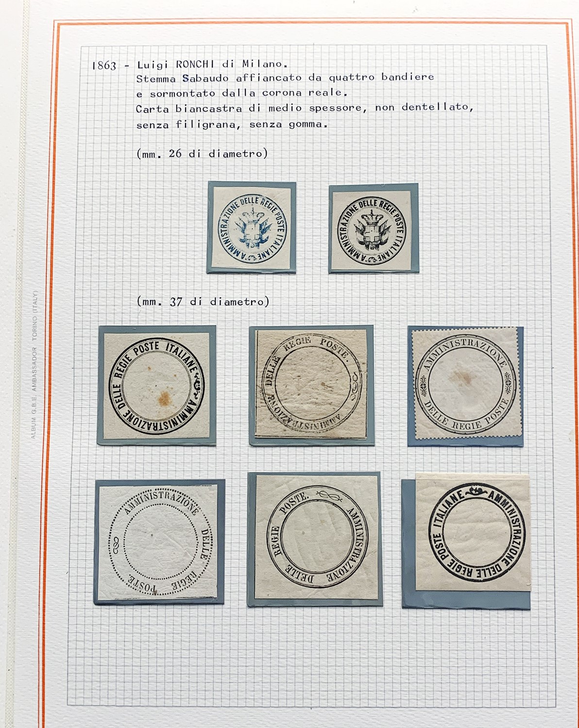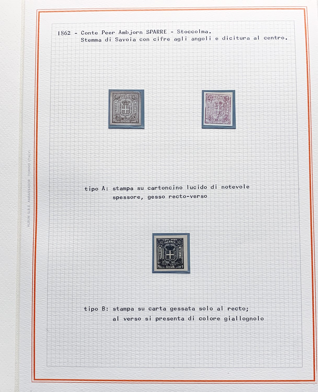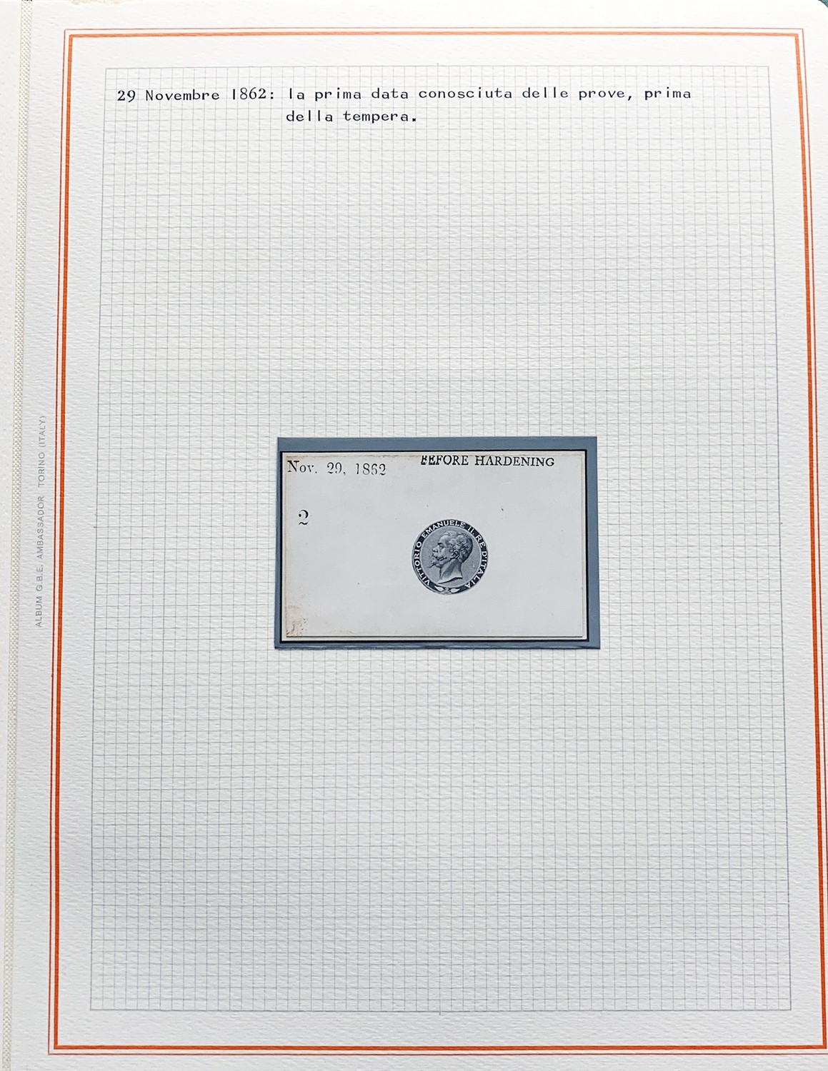 1860/74 - REGNO D'ITALIA - PROVE E SAGGI PER FRANCOBOLLI E FISCALI: interessantissima collezione del settore, montata su fogli Bolaffi, comprendente prove Sparre (3), Pellas (10), Ronchi (8), Coucourde (3c), Wentch (4), Ronchi etichette (8), Re (7), altre ignote (34); prove di conio su cartoncino Bigola (3 grandi), 2L DLR, altre Prove di conio su cartoncino (31) e prove per passaporti (36). Insieme irripetibile di grande qualità