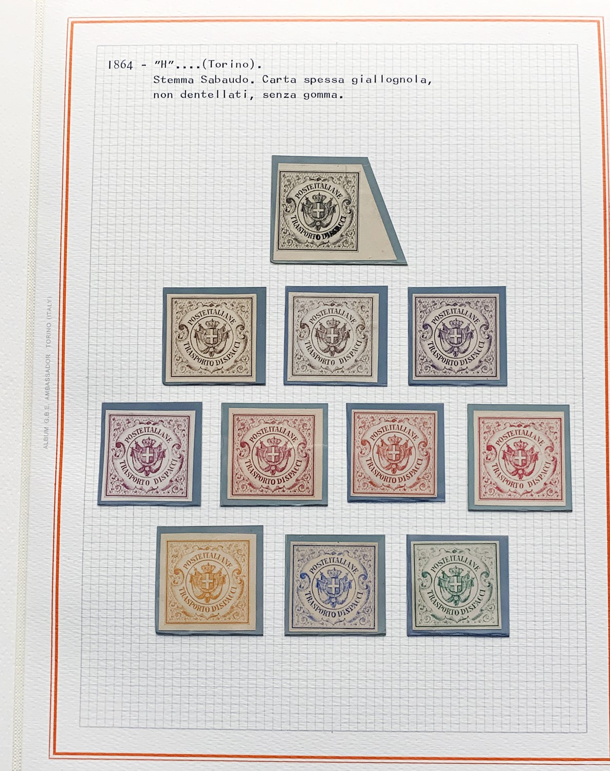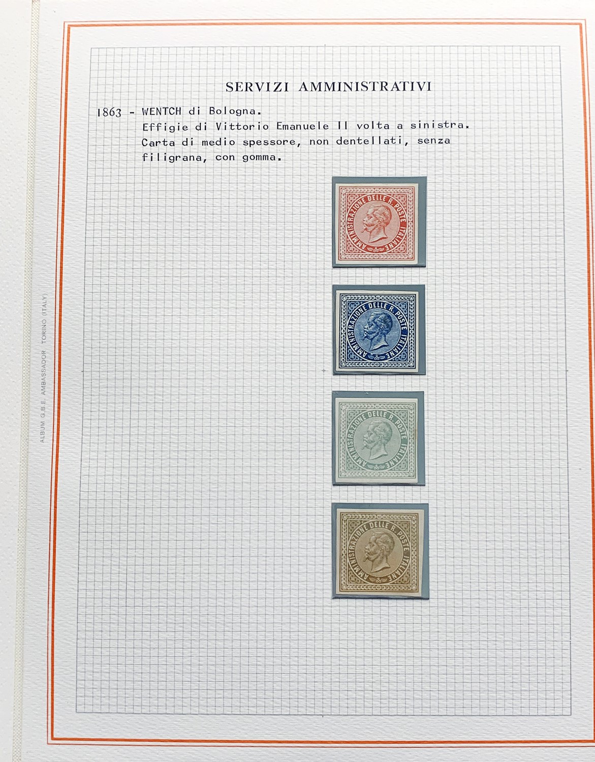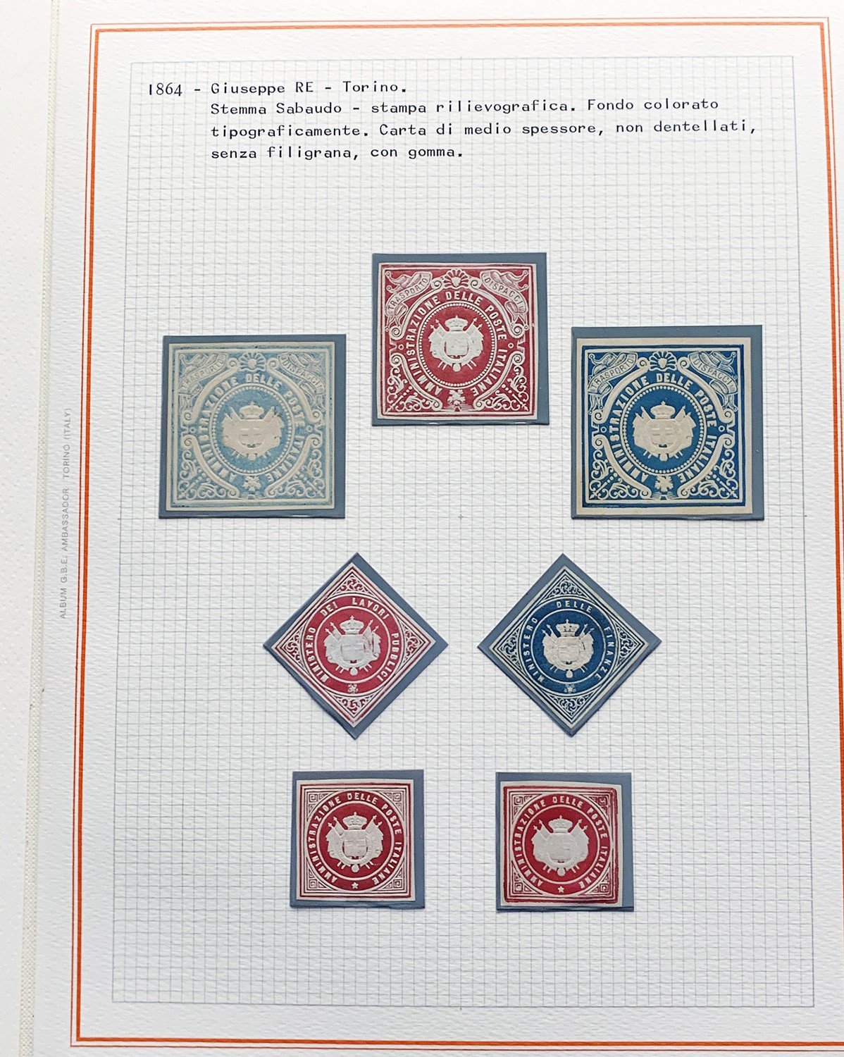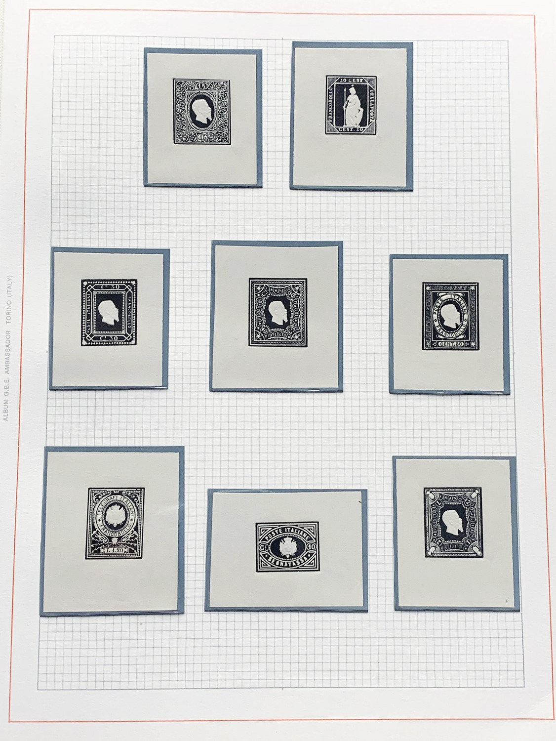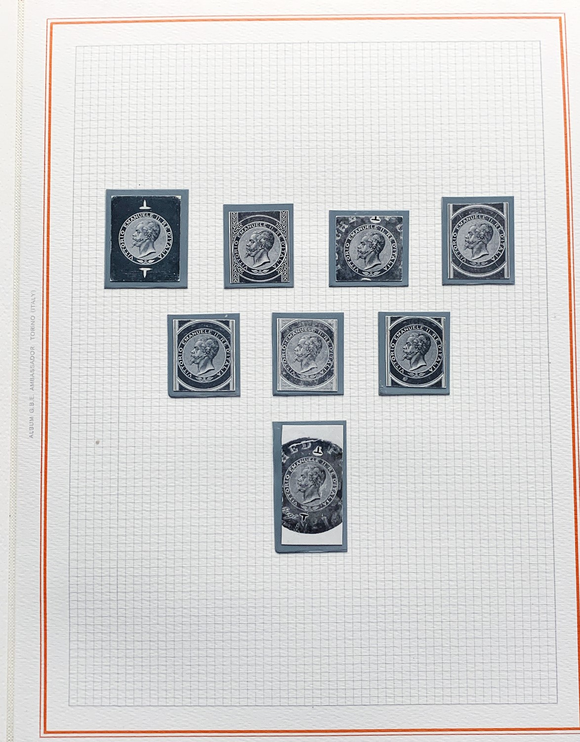 1860/74 - REGNO D'ITALIA - PROVE E SAGGI PER FRANCOBOLLI E FISCALI: interessantissima collezione del settore, montata su fogli Bolaffi, comprendente prove Sparre (3), Pellas (10), Ronchi (8), Coucourde (3c), Wentch (4), Ronchi etichette (8), Re (7), altre ignote (34); prove di conio su cartoncino Bigola (3 grandi), 2L DLR, altre Prove di conio su cartoncino (31) e prove per passaporti (36). Insieme irripetibile di grande qualità