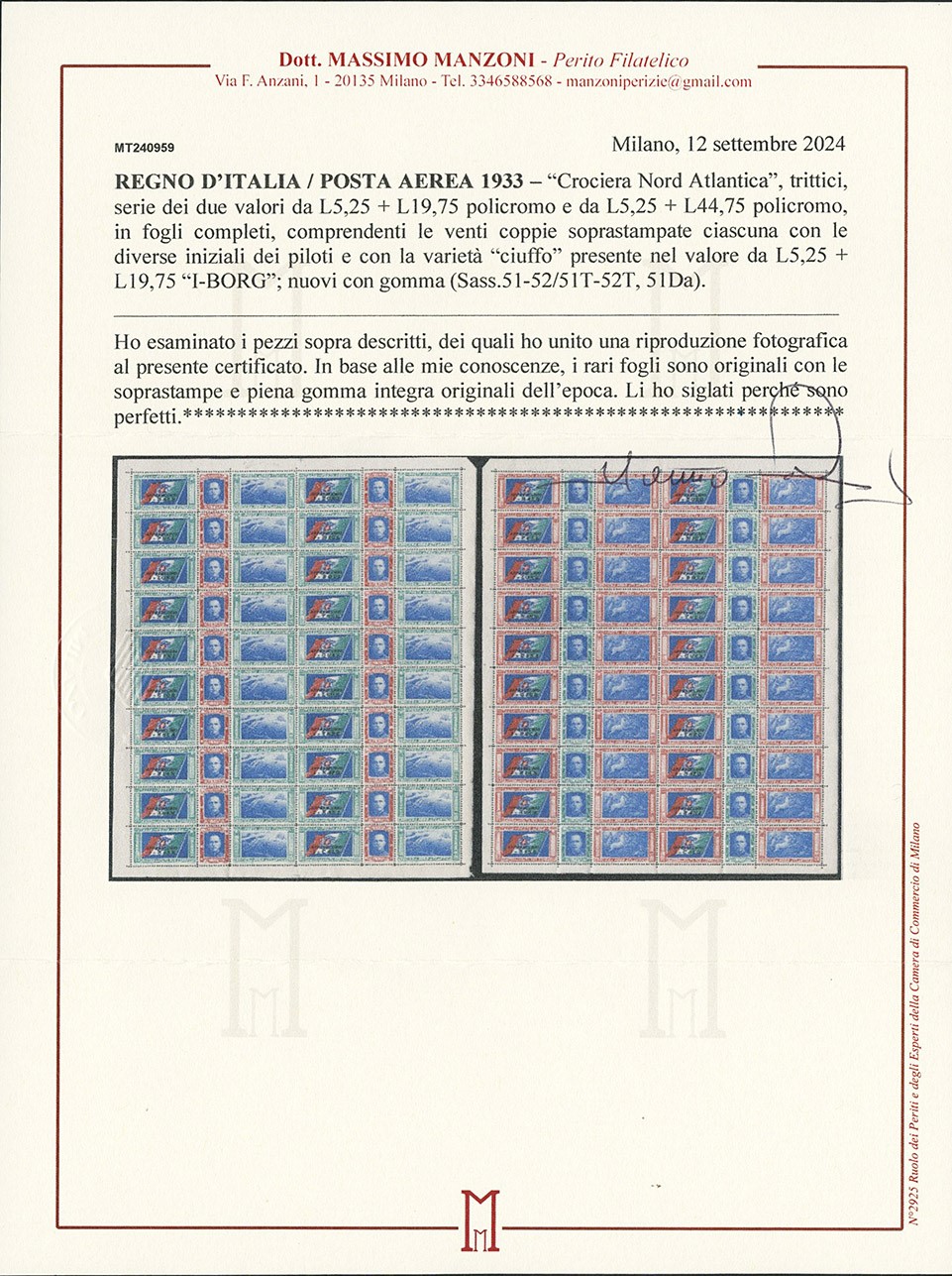 1933 - North Atlantic Cruise, the two complete triptych sheets including the 5,25L+19,75L I-BORG with "tuft" variety. Extremely fine, Cert. Manzoni (Sassone PA51Da - Euro 22.075) (Image 1)(Image 2)(Image 3)(Image 4)(Image 5)(Image 6)