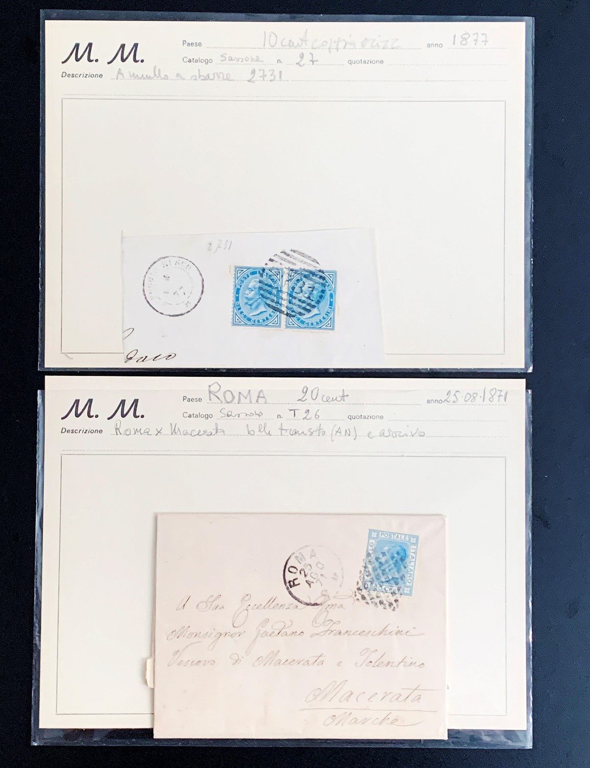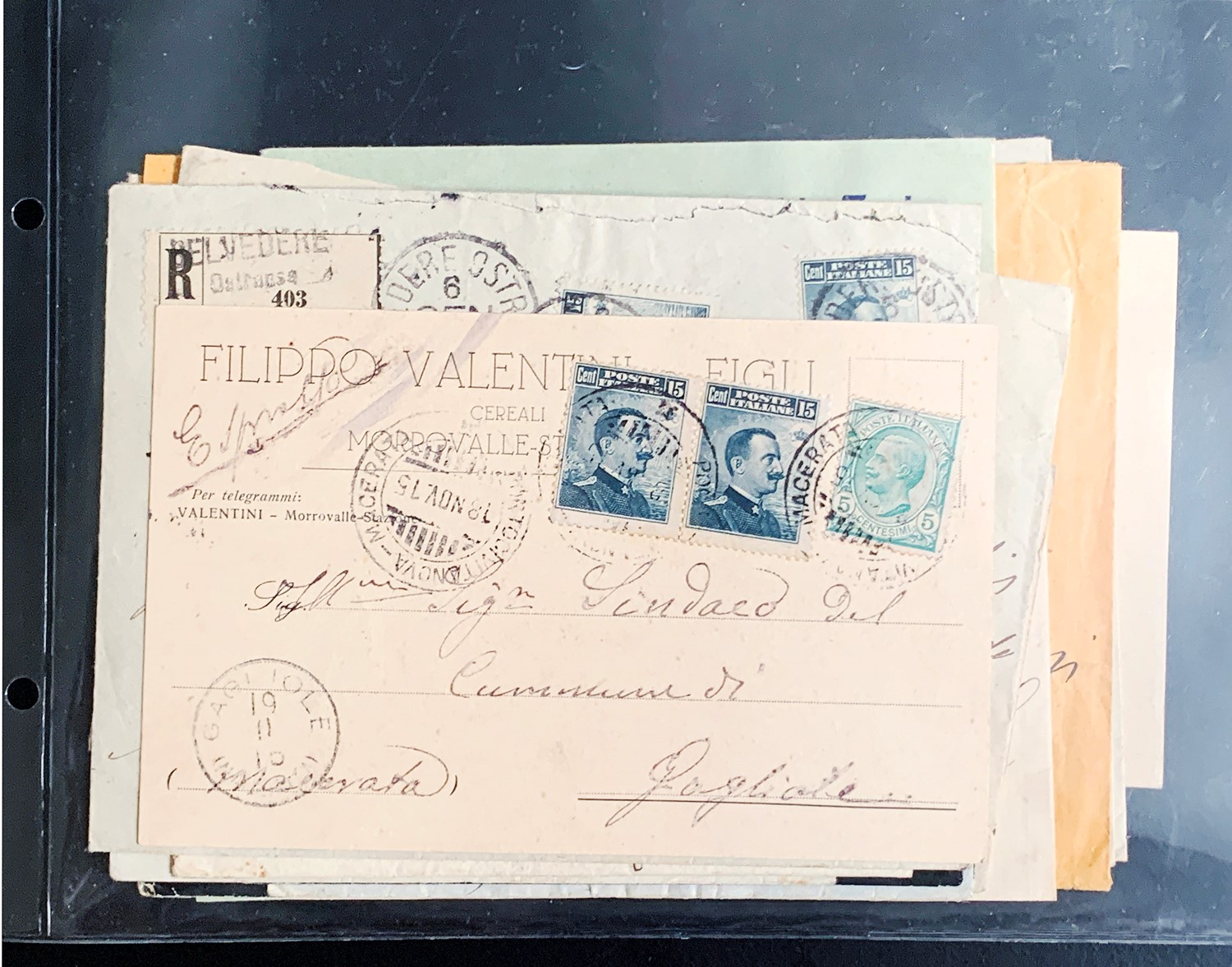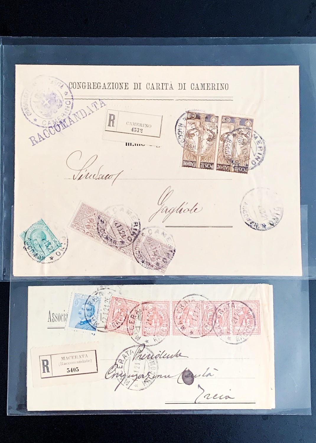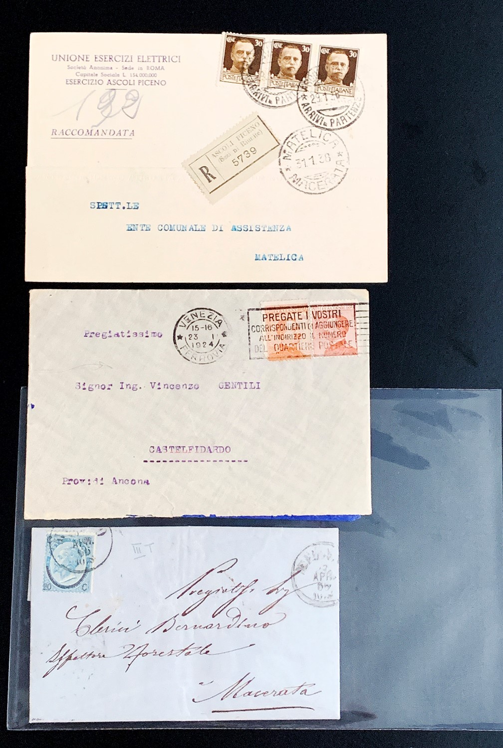 1862/1930 - ITALIA REGNO: insieme di oltre 100 oggetti di storia postale (lettere, cartoline, frontespizi, frammenti, etc.) prevalentemente con annullamenti delle Marche. Notate diverse affrancature interessanti e non comuni. Insieme generalmente di ottima qualità