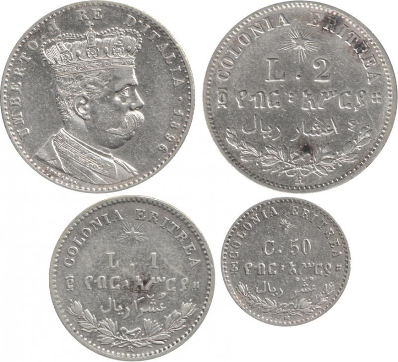ERITREA: Umberto I 1890 50c, 1891 1 lira, 1896 2 lira (carbon spots) KM 1-3, all VF. (3) (Image1)