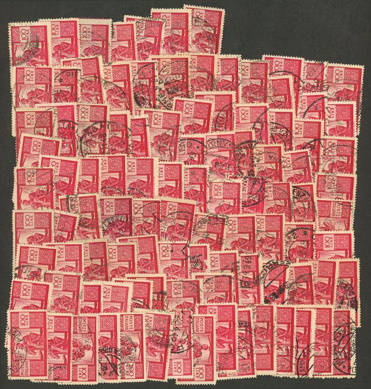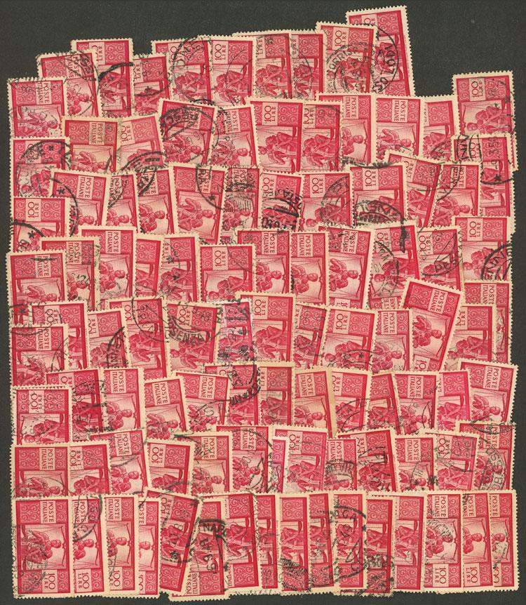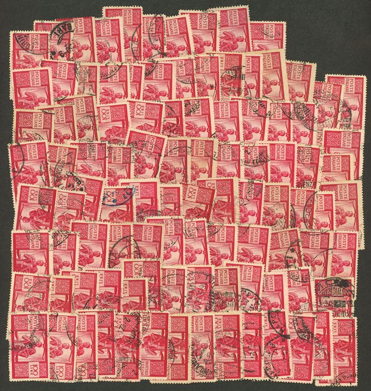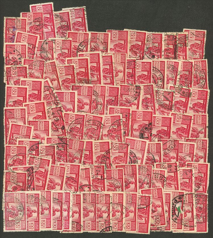 Yvert 503, 1945/8 Democratica 100L. red, 100 used stamps, UNCHECKED, very fine general quality! (Image)