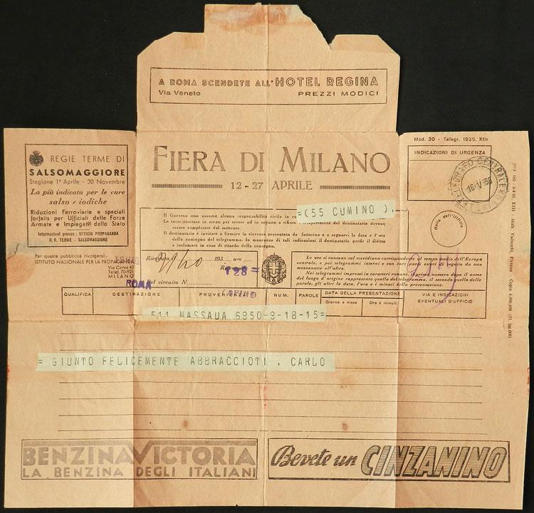 Telegram of the year 1935 with interesting ADVERTISEMENTS on front and back: Cinzano, benzene, HOTEL, travellers' cheques, bank, and method to learn foreign languages, VF, rare! (Image)