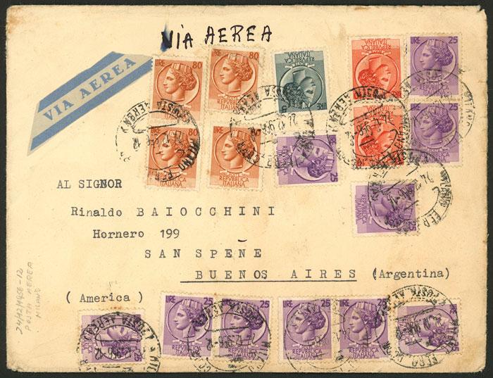 24/DE/1956 Milano - Argentina, airmail cover with attractive multicolor postage of 595L. (one stamp originally with defects), on back arrival mark of Buenos Aires, very attractive! (Image)