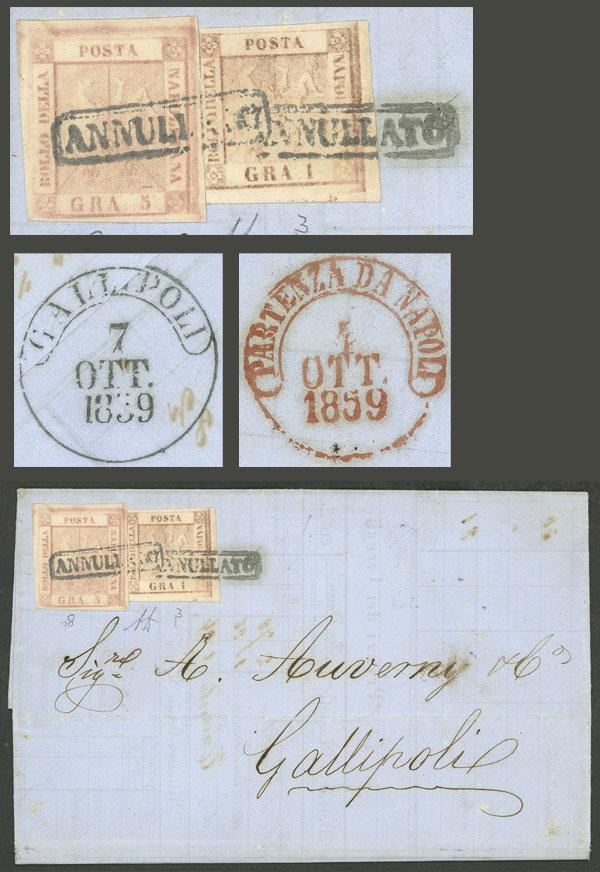 Entire letter sent from Napoli to Gallipoli on 4/OC/1859 franked with 6Gr. (Sc.4 + 2), arrival backstamp, very fine quality, signed by Diena (Image)