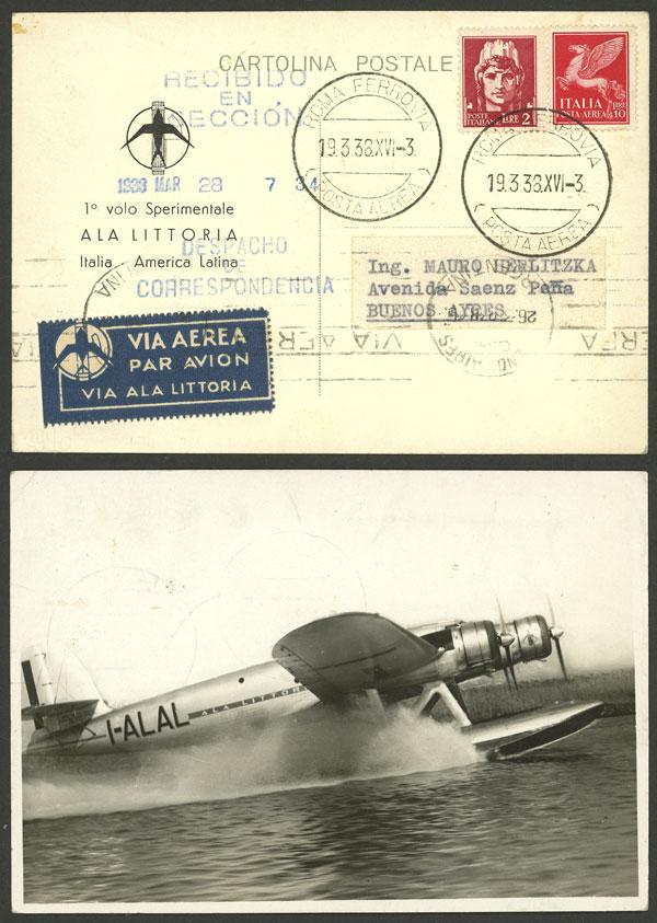19/MAR/1938 Roma - Buenos Aires, experimental flight of Ala Littoria, card with view of I-ALAL seaplane, and arrival mark on front, excellent quality! (Image)