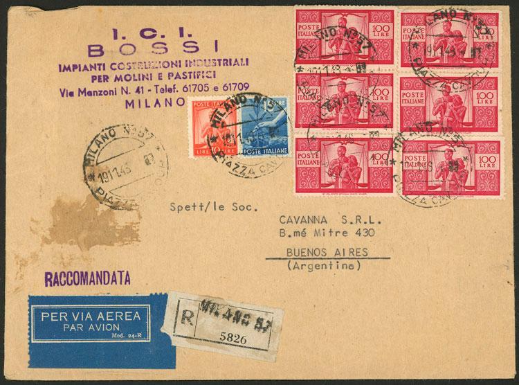 Registered airmail cover sent from Milano to Buenos Aires on 19/NO/1948 with splendid postage of 625L., very fine quality! (Image)
