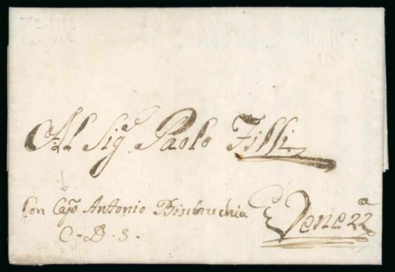 1783 pair of entires to Venezia, one an exact duplicate apart from annotation that a duplicate is being sent, the first sent care Capo Antonio Biserechia, the second care of Trabacolo Capt Zuane Garanin, both with manuscript "C.D.S." (Che Dio Salvi - God Save Us), very fine condition (Image)