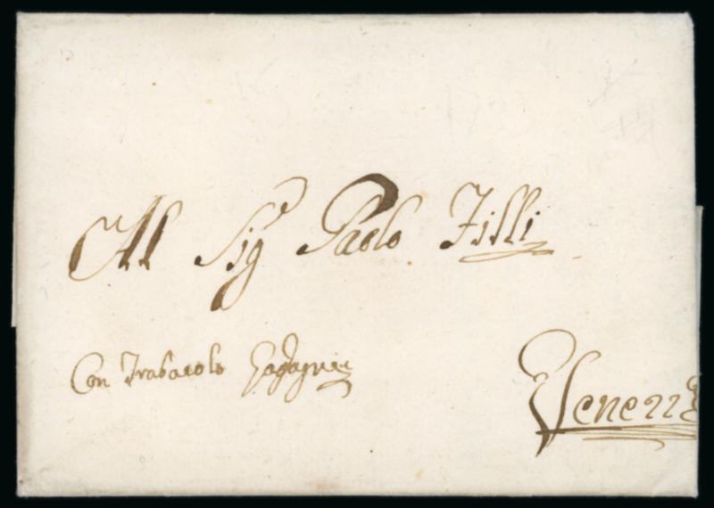 1765 entire letter from Cephalonia to Venezia bearing a fine bold strike LETTERE/DA MARE handstamp, in use according to Zaphirio between 1764 and 1766, a couple of minor stains not detracting. (Image)