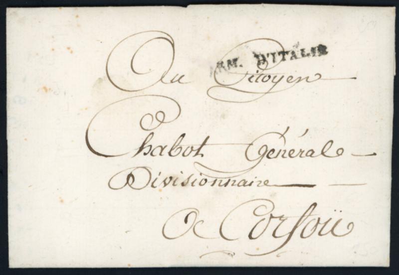 French Republican Rule: 1797-99 undated outer letter sheet addressed to a General Chabot, the then Governor of Corfu in the revolutionary style to "Citoyen" Chabot, straight-line ARM. D'Italie handstamp top right. Zapiriou records only having seen three items from this period, fine and rare. (Image)