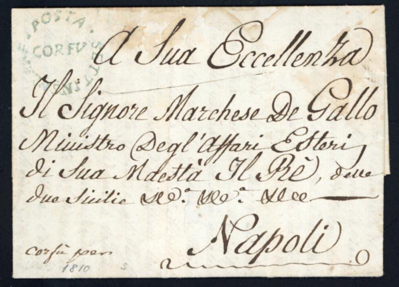 French Imperial Rule: 1810 (October 29) disinfected entire from Constantinople to Naples written in Italian showing fine blue-green Posta Settinsulare Corfu seal used during this brief period of French Imperial Rule. This entire is reproduced and discussed on page 100 of Zapriou's book, stating it to be the earliest known use of the handstamp as a transit mark, some slight vinegar splashing from disinfection. an important item. (Image)