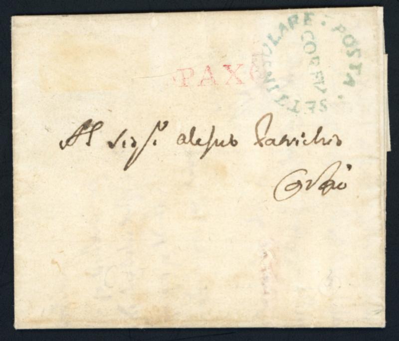French Imperial Rule: 1811 (August 22) entire from Paxo to Corfu bearing red straight-line PAXO handstamp and blue-green Posta Corfu Settinsulare handstamp, used during the brief period of French Imperial rule, Zaphiriou states that ten Paxo seals are known, seven of the to Corfu. Ex Drossos, R Simmermacher Cert (2011) (Image)