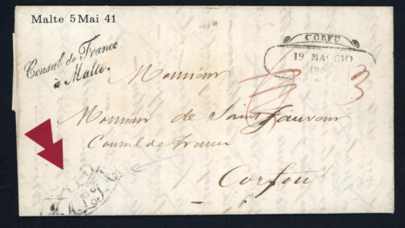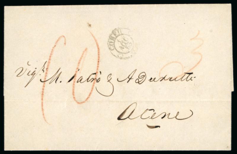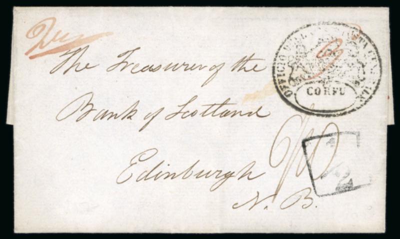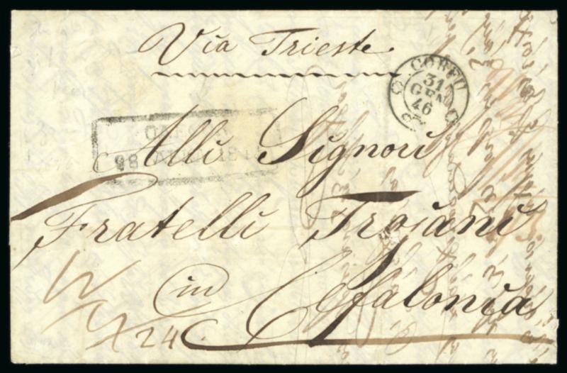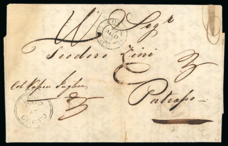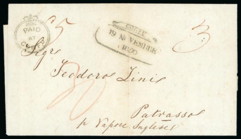 1846 (22 Aug) entire letter from Corfu to Patras, endorsed "Col Vapour Ingles" above a fair strike of PAID AT CORFU Crown Circle bottom left, small despatch cds top centre, manuscript, "3" local charge and "5" British Packet rate, plus "30" Greek charge, arrival backstamp, arrival backstamp, light vertical filing crease and some ink erosion at centre. (Image)