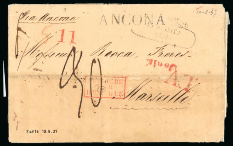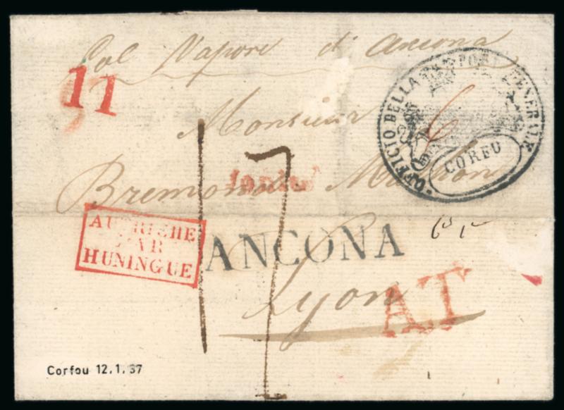 1837 Mail to France: Outer letter sheet to Lyon, France endorsed "Col Vapore d'Ancona" bearing large Corfu seal, black ANCONA handstamp at centre, unclear Ancona disinfection cachet on reverse, red scarce 'Jonia' handstamp and red A.T, red framed French entry and arrival backstamp, reddish manuscript "6" in seal for local carriage, manuscript "5" for ship's fee to Ancona, overstruck red '11' handstamp for Trieste charge and large central "17" decimes for France, horizontal creasing and a transfer date bottom left (Image)
