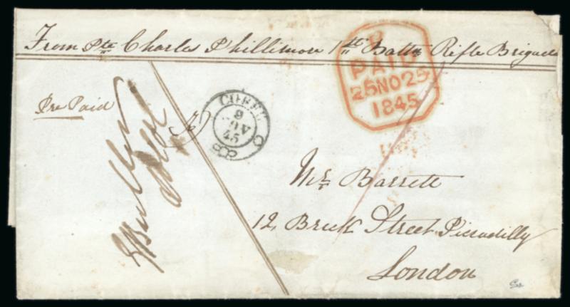 1845 (8 Nov) Mail to Great Britain: Soldier's concessionary entire "From Pte Charles Phillimore, 1st Battn Rifle Brigade" to his "brother" in London, the entire also being endorsed "Pre Paid" and signed by Officer, small black despatch and arrival cancels, small part of entire missing at back, scarce (Image)
