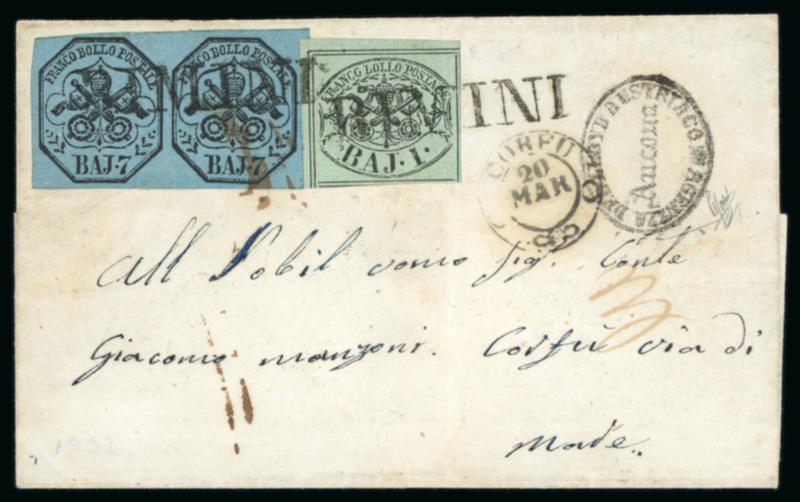 1852 outer letter sheet to Corfu bearing 1b showing double frame lines on two sides and virtually complete on others plus pair 7b with four good margins tied two straight-line RIMINI handstamps, routed via Ancona with oval Agenzia del Lloyd Austriaco Ancona handstamp at right partly overstruck by arrival cds, brown '10' for 10soldi ship's charge and red "3" on front for Ionian incoming postal charge, Holcombe Cert (1992) and RPSL (2004), Ex Linze and Müller. (Image)