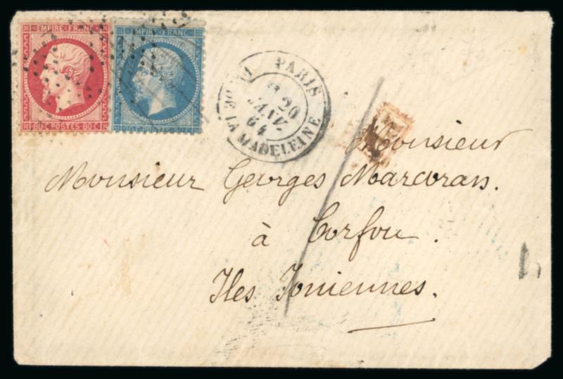 1856 Mail from France: Envelope from Le Havre to Corfu via Paris, Bureau Francais A Bale (Switzerland) and Triest, blue Zacynthos transit and final arrival with variety of manuscript rates "25" decimes postage to Paris, blue "9" to Trieste, red ships charge from Trieste and "3" for Ionian charge plus 1864 stamped envelope with 20c and 80c from Paris, routed via Triest and showing faint red arrival cds. (Image)