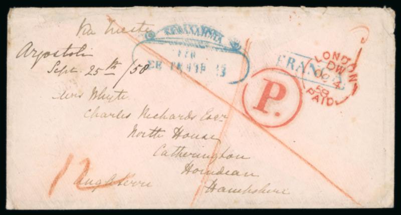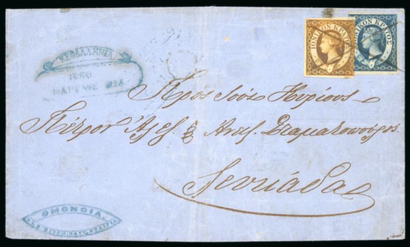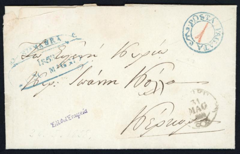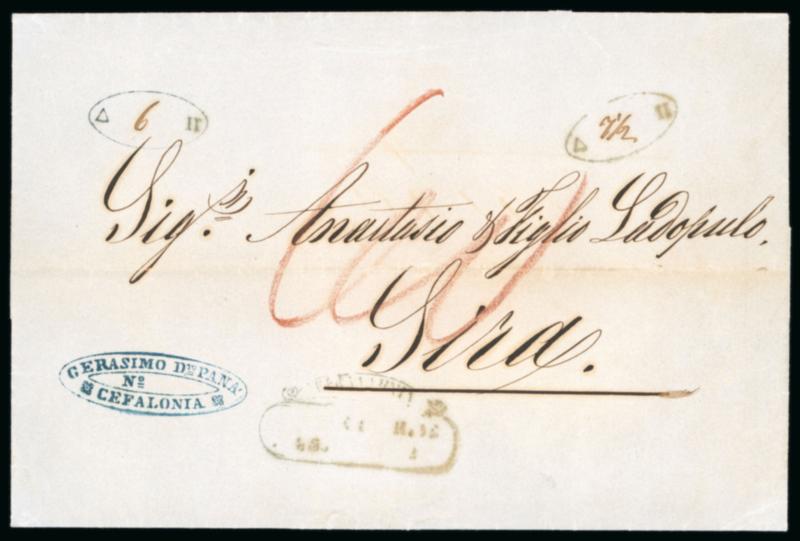 1858-64 seven entires from the last period of the British Protectorate, seven entires with 1853 Cephalonia to Corfu, 1858 Santa Maura to Corfu with fine blue Posta Pagata handstamp, 1861 Cephalonia to Santa Maurs (2), 1862 Zacynthos to Cephalonia and scarce Kythera to Ithaca with blue Posta Pagata prepayment handstamp, 1864 Zacynthos to Cephalonia on 4th march, six weeks later the British departed and the Ionian Islands became part of Greece. (Image)