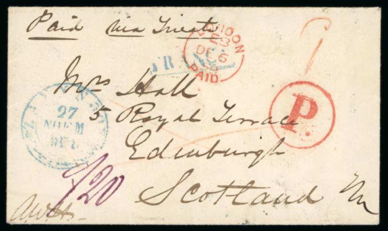 1858 Mail to Great Britain: Envelope to Edinburgh, Scotland endorsed "Paid Via Triest" bearing blue despatch with framed FRANCO in same blue colour, "1d" red manuscript local charge, red P in circle applied in transit at Aachen, London Paid cds, fine and attractive (Image)