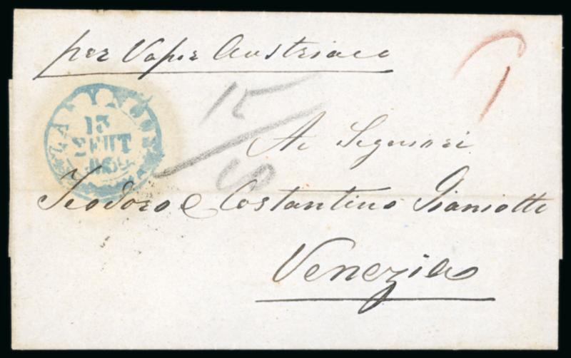 1859 entire to Venice, endorsed "por Vapor Austriaco" with blue Zacynthos double-ring despatch, red "1d" Ionian postal charge, pencil "15/10" accountancy for the 15k Austrian ship's charge to Trieste, and 10 kreuzer for carriage from Trieste to Venice, to be paid by recipient. R Simmermacher Cert (2012) (Image)
