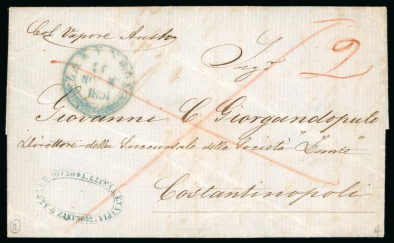 1861 two page entire to Constantinople, endorsed "Col Vapore Austr" with blue Zacynthos date stamp, Lloyd Agenzia Constantinopoli arrival backstamp, red manuscript "2" for Ionian postage (since 1859 if adhesive stamps not used the 1d charge was doubled), red St Andrew cross indicating prepayment. (Image)