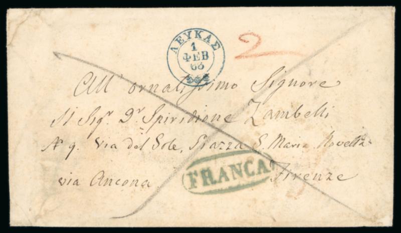 1863 (1 Feb) envelope to Firenze bearing central Lefkas double circle cds, endorsed "Via Ancona", reverse with Bologna transit and arrival cds, obverse with red manuscript "2" indicating Ionian postal duty, green oval-framed FRANCA and grey St Andrews cross indicating prepayment to destination, reverse with manuscript "30/30" for ships charge to Ancona and carriage to Florence. (Image)