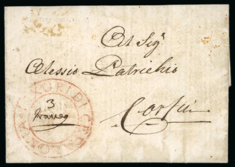1830 entire to Corfu bearing a fine strike of Officio Della Posta Di Cefalonia seal, showing a portrait of Cephalus and his dog, Lelaps, Cephalonia scroll despatch on reverse, oval royal large Corfu handstamp on front with red manuscript "4", a scroll arrival backstamp of 17 March. Good condition with a fine example of the pictorial handstamp, one of the earliest such cancels. (Image)