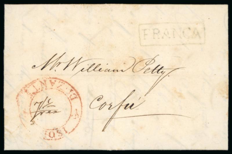 1818 entire to Corfu bearing a good strike of brown-red Isole Di Zante Type A (Zaphiriou p.204) with manuscript "1 1/2" obols for double weight letter plus framed FRANCA top right, good condition (Image)