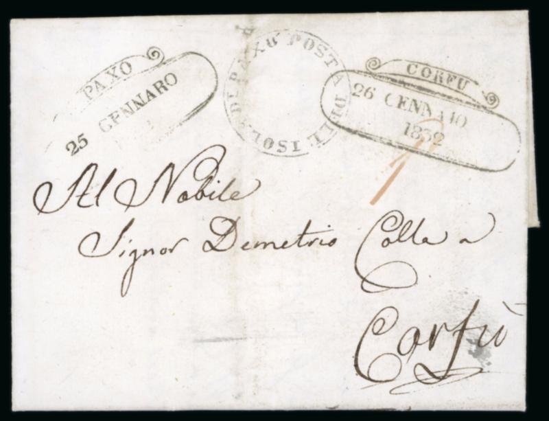 1832 (25 January) entire to Corfu with Paxo scroll (type B) despatch fine circular Paxo Posta Pagata prepayment handstamp with manuscript "1" for postage to Corfu alongside, Corfu black scroll arrival cancel each of next day, a fine well balance entire. (Image)