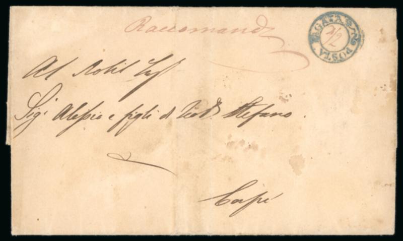 1837 (9 September) entire to Corfu bearing green Santa Maura scroll despatch date stamp on reverse, the same date as letter, front with fine double circle Posta Pagata prepayment mark in same colour, red manuscript charge in centre, also endorsed to left with "Raccomand" in same pen, a rare early registered item for which very little information currently exists. (Image)