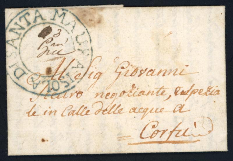 1809-15 British Military Occupation: 1815 (22 March) entire written in Italian to Corfu bearing good strike of the large green ISOLA DI SANTA MAURA double-ring handstamp. This Island had been taken from the French in April 1810 and Corfu, the last island to fall, surrendered June 1814 before the Second Treaty of Paris in Nov 1815, a scarce cover arriving during the British Military Occupation. (Image)