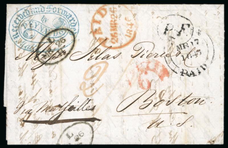 1846 Entire in English dated 14 March to Boston, USA, endorsed "Via Marseille", written from Zante and probably carried on HMS Volcano to Malta where Malta Paid double arc date stamp on front and similar without Paid on reverse, carried from there by HMS Locust to Marseille though no transit mark applied, thence to London and Liverpool and red cursive SHIP/6 applied in red on arrival, the top left shows a fine strike of the Maltese forwarding agents cachet, some hinge reinforcements to the entire, a fine transatlantic cover. (Image)