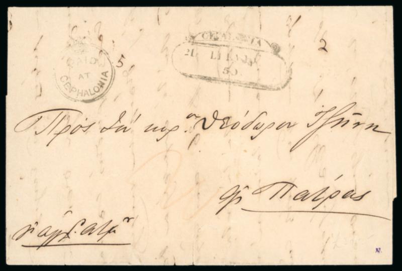 1850 (21 Jan) entire letter (in Greek) from Cephalonia to Patras showing good strike of PAID AT CEPHALONIA Crown Circle at left ornate datestamp alongside, arrival cds on upper flap, filing fold causing small split at base, still a good example of this rare handstamp. (Image)