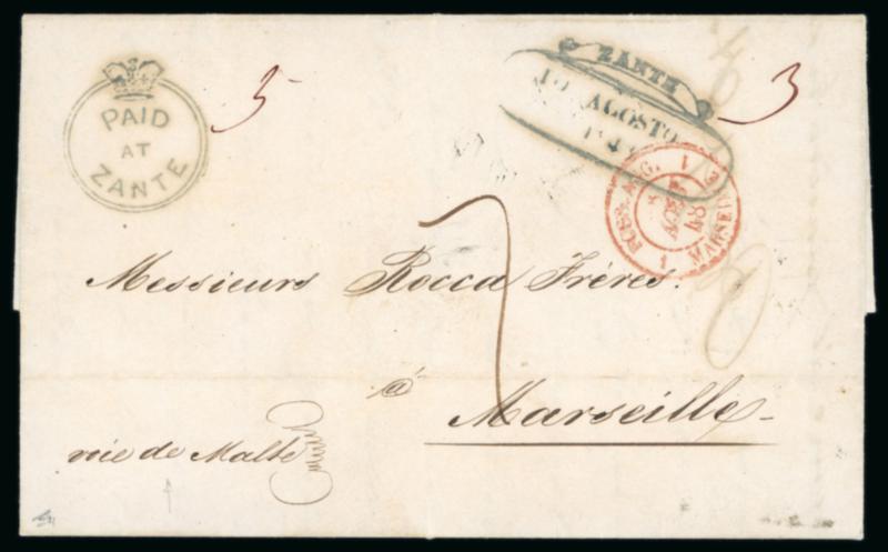 1848 (10 Aug) entire letter in Italian from Zante to Marseille, endorsed "voie de Malte" with a particularly fine strike of the PAID AT ZANTE crown circle at top left and ornate framed handstamp at right over-struck by red French entry cds, reverse with fine MALTA transit across flap. An extremely fine example, RPS Cert (2012) (Image)