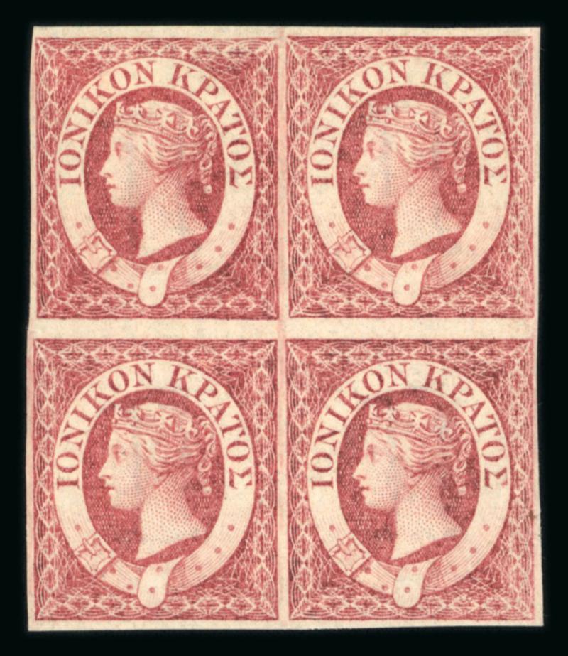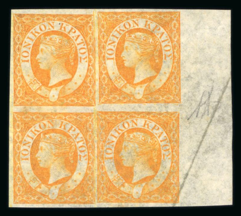 1859 1/2d orange, right-hand marginal block of four (pos. R7-8, 11-12) with large to very large margins, the upper right stamp showing the R7/12 MAJOR RE-ENTRY (doubling of IONIKON and extra curved line at left to buckle), natural paper flaw in margin at right, very fine colour for this value and the variety mint never hinged. (Image)