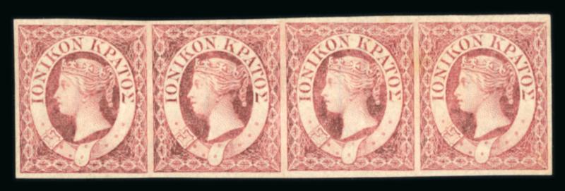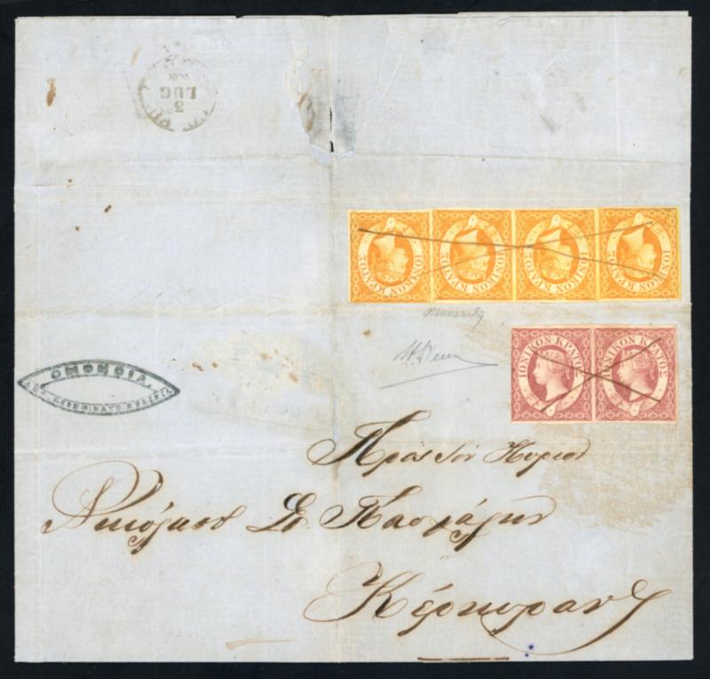 1859 Quadruple rate entire dated July 1 from Cephalonia to Corfu bearing on front 1d pair with margin barely touched at left and, on reverse, paying the Austrian shipping fee a horizontal strip of four 1/2d. orange with good to large margins all round, the far right stamp printed a little higher than others and shows partial doubling of engraving with extra line down to buckle at left, both strips with single manuscript cross, very faint despatch to right of Omonoia company handstamp, arrival backstamp (3 July). A very desirable item, certainly one of the finest number ones available for the Ionian Islands and indeed elsewhere. A great rarity. A Dienna Cert (1964) and Karamitsos (2015) (Image)