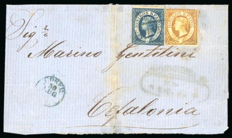 1859-60 three items with part entire from Zacynthos to Syros franked 1d blue, good to large margins tied by double-ring unclearly dated cancel, 1d three good margins, outer letter sheet Cephalonica to Ithaca with pen cross (APS Cert 2010) and a 1860 Zacynthos to Corfu entire, the stamp with damaged bottom right corner with four line pen cancel, fine blue despatch at left and on reverse arrival cancel with inverted date and red manuscript 1/2d shipping charge.