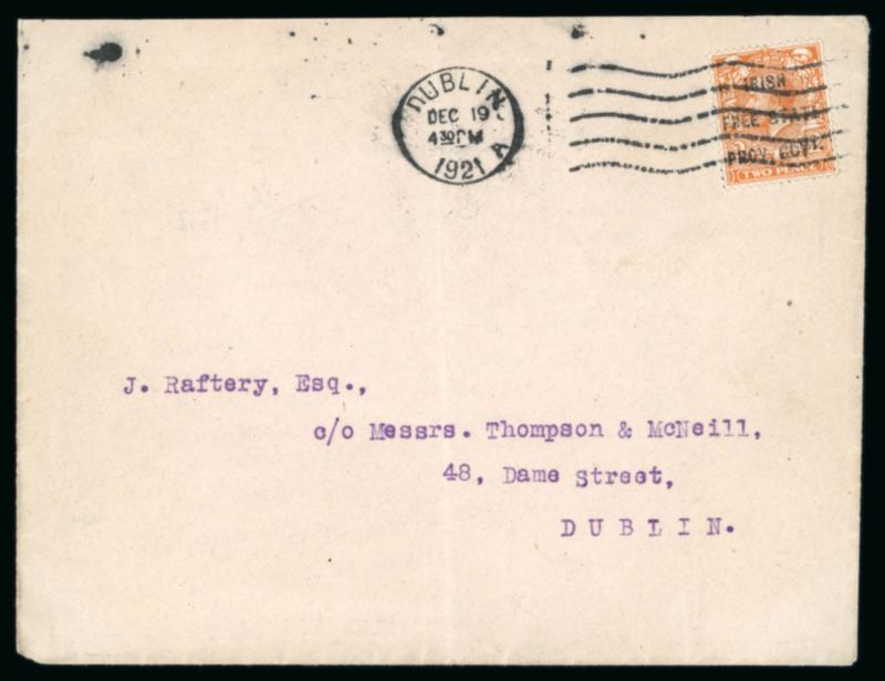 DUBLIN: 1921 Envelope franked GB 2d orange overprinted IRISH / FREE STATE / PROV.GOVt, tied by machine cancel dated DUBLIN/DEC.19.1921, a very fine and rare usage of the unofficial overprint