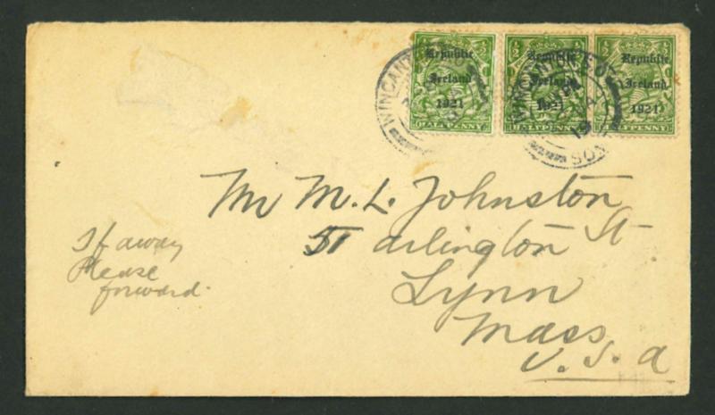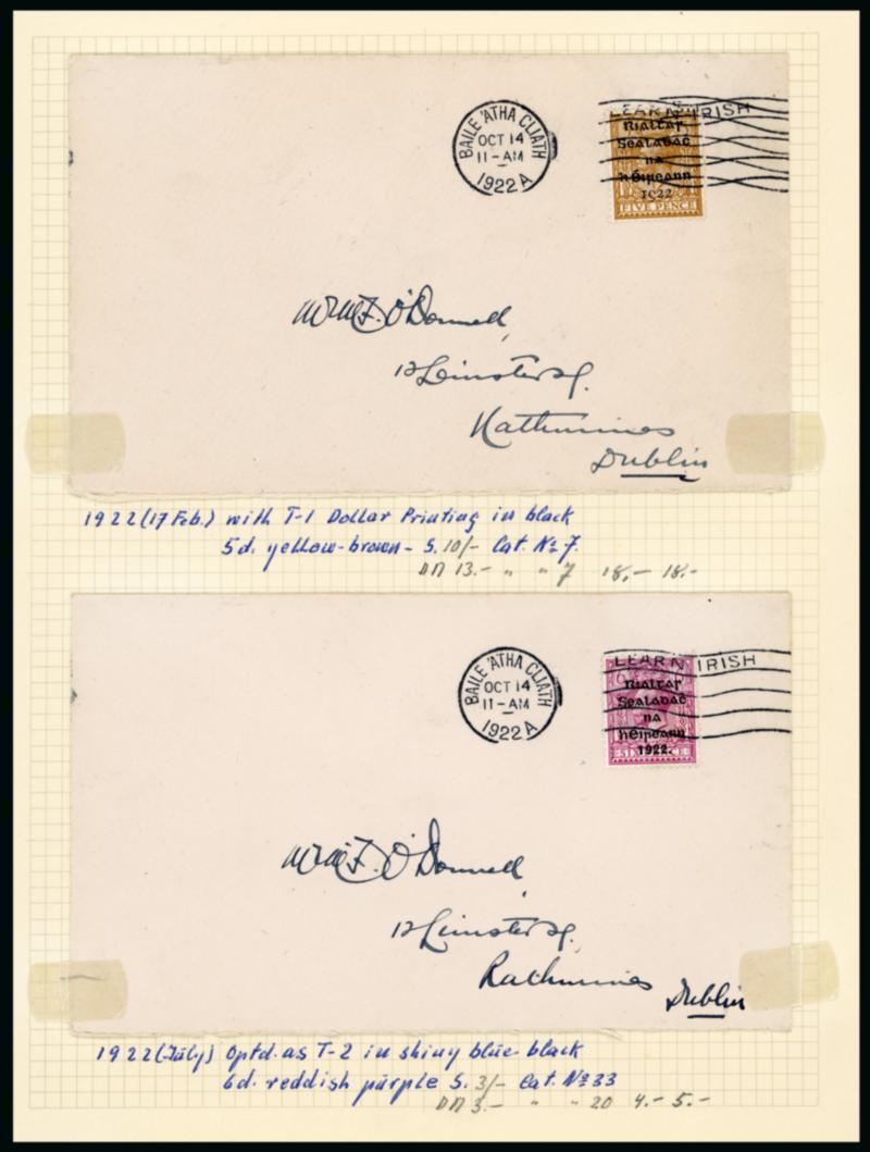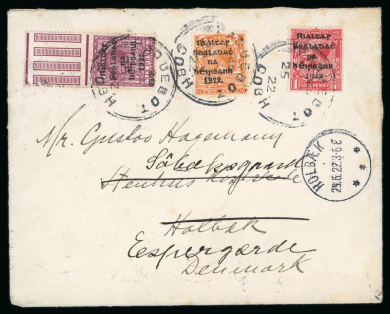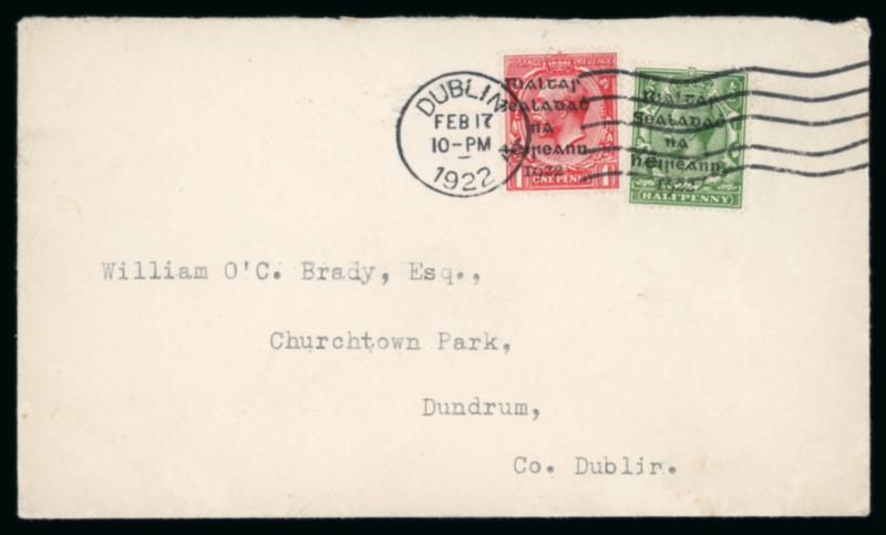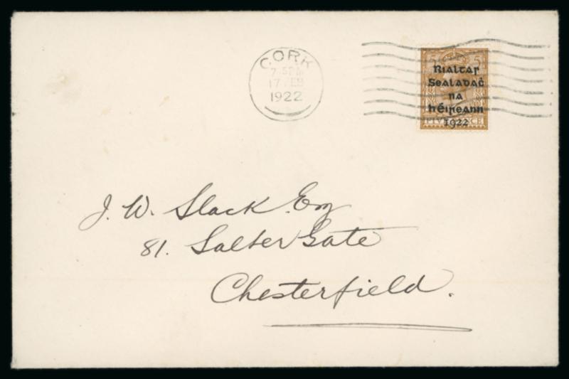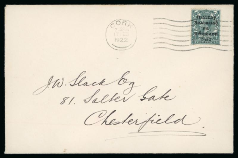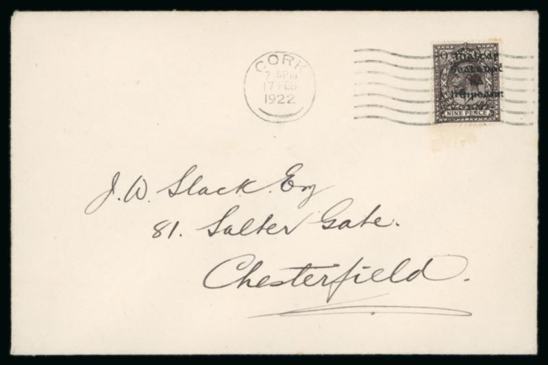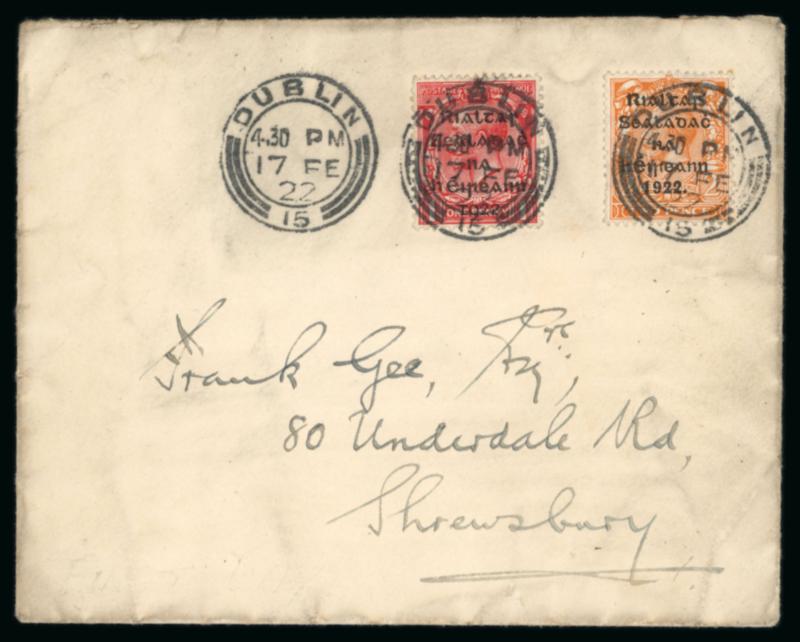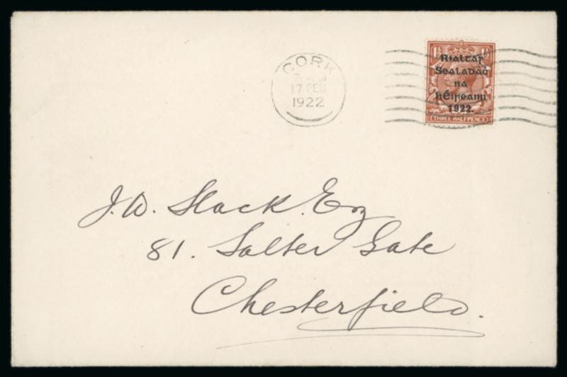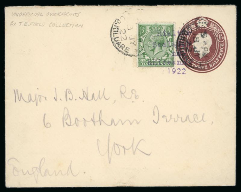 1922 (18.7) GB 1 1/2d brown, stationery envelope, franked GB 1/2 green, pay the 2d rate to York, bearing "Rialtas Sealadac na hEireann 1922" typed unofficial overprint in violet superimposed over both the stamps and embossed stationery impression, plus two fragment with similar frankings showing slightly different typed overprints in black, one being inverted, a very scarce trio, ex. Thomas Field (Image)