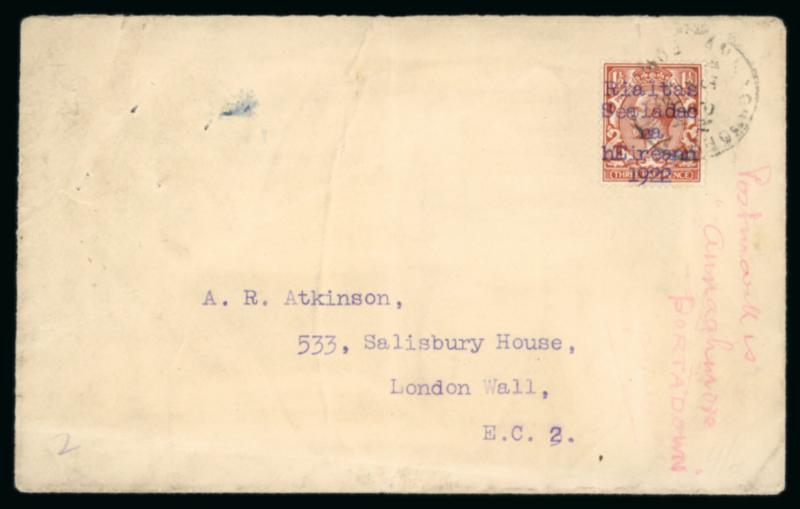 1922 Envelope to London, franked GB 1 1/2 red-brown, bearing "Rialtas Sealadac na hEireann 1922" typed unofficial overprint in violet, cvr wrinkles, scarce (Image)
