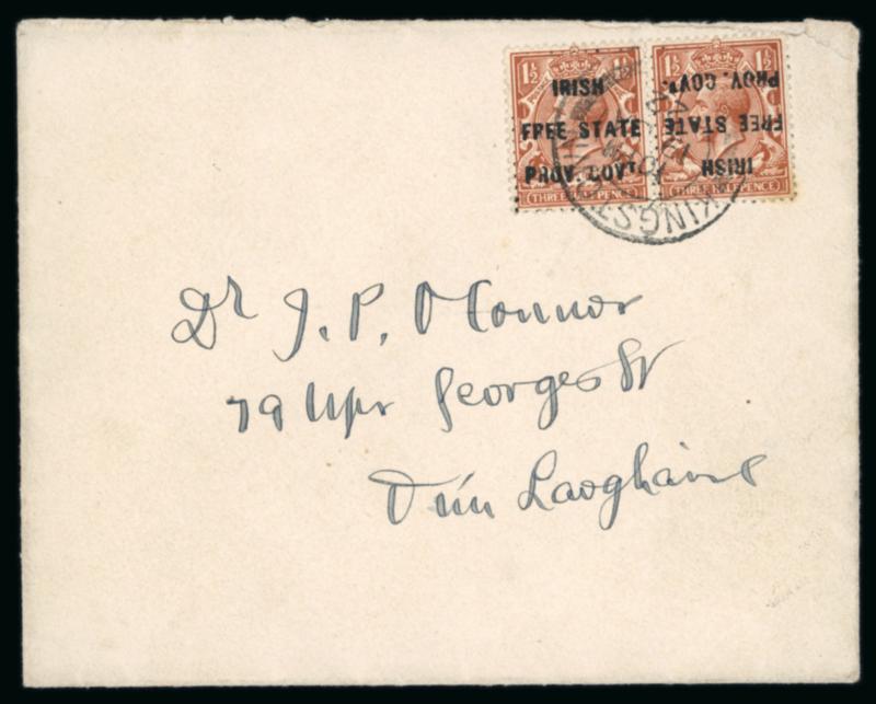 KINGSTOWN: 1922 Envelope franked GB 1 1/2d red-brown, horizontal pair overprinted IRISH/FREE STATE/PROV.GOVt one being inverted, tied by cds dated KINGSTOWN/19.JA.1922, a very fine and rare usage of the unofficial overprint with the variety (Image)