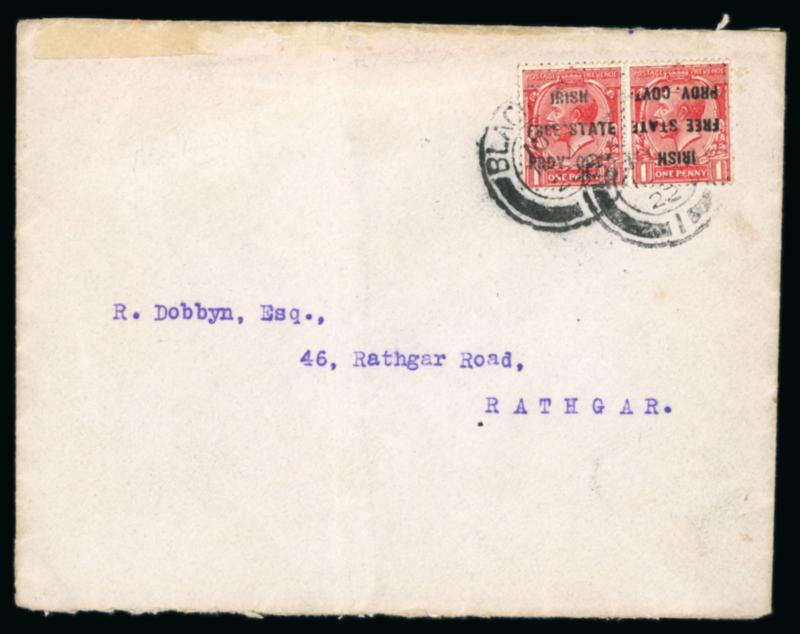 BLACKROCK: 1922 Envelope franked GB 1d scarlet, horizontal pair overprinted IRISH/FREE STATE/PROV.GOVt one being inverted, tied by cds dated BLACKROCK/18.JA.1922, a very fine and rare usage of the unofficial overprint with the variety (Image)