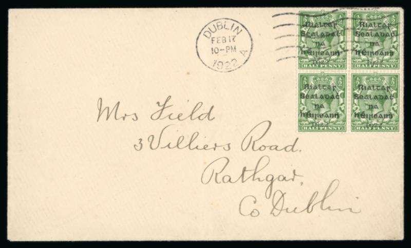 1/2d green, block of four, tied by Hey-Dolphin machine first day cancel DUBLIN/FEB.17.1922/A, on envelope sent within Dublin to Rathgar, plus 1/2d in mint block of four, very fine and a scarce first-day usage (Image)