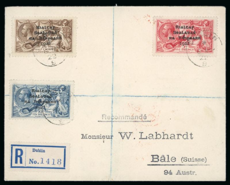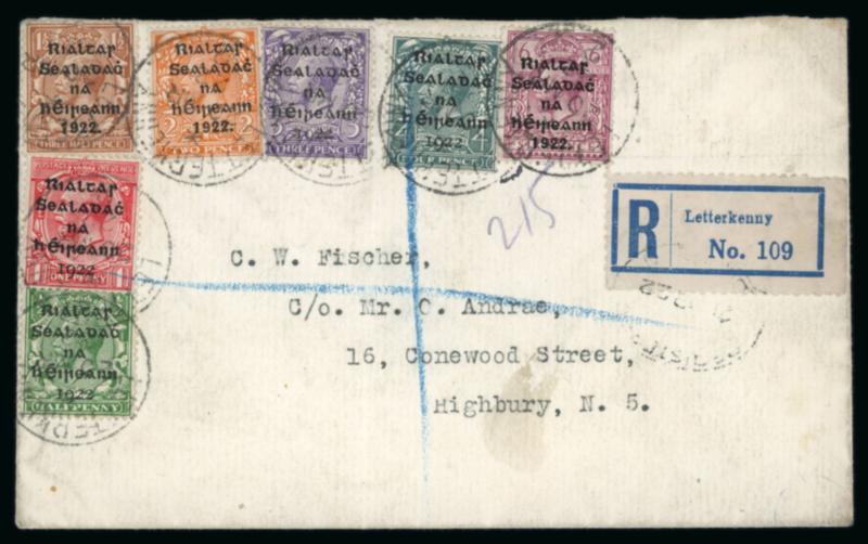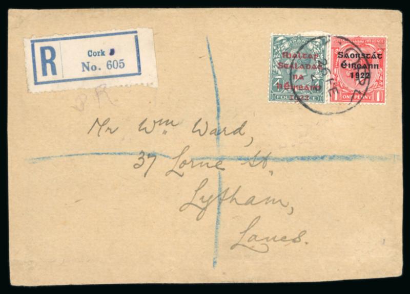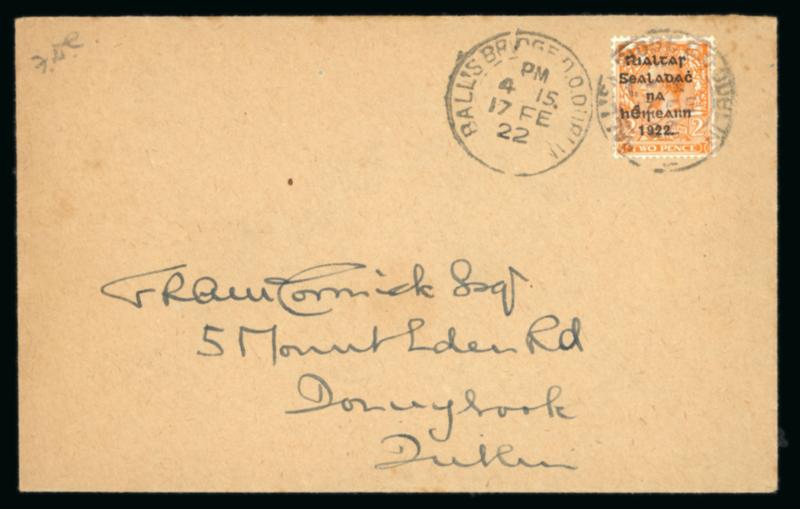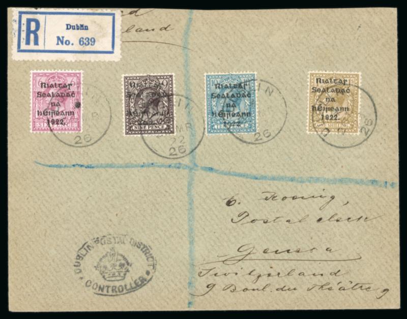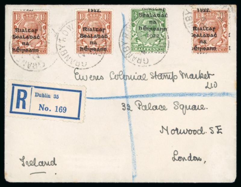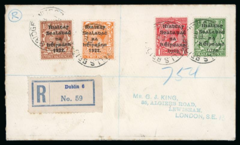 1 1/2d red-brown and 2d orange, die II, plus Dollard 1/2d and 1d, singles, all tied by first day cancel BALLSBRIDGE/17.FE.1922, on envelope registered envelope sent to London, plus additional registered cover with the same franking, very fine and a scarce first-day usage (Image)