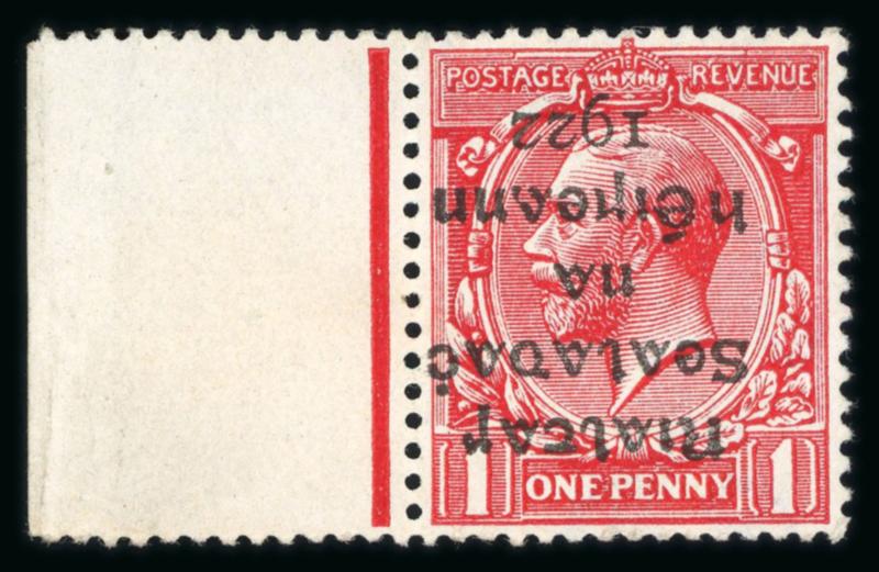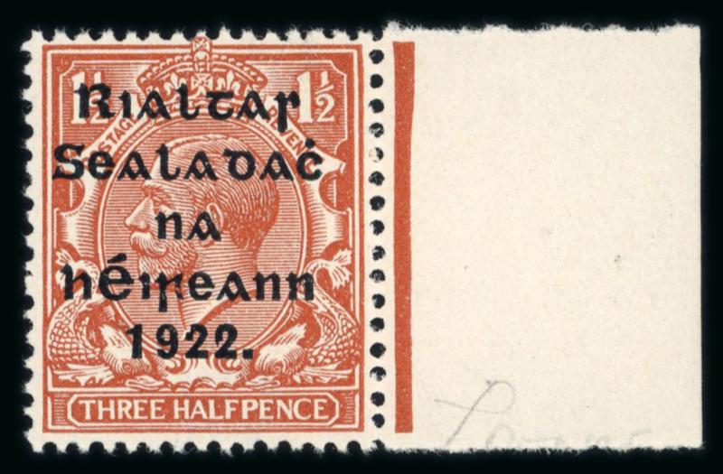 1d scarlet, mint nh left sheet marginal single, with overprint shifted to the left and showing overprint inverted variety, fresh, very fine, and scarce. Hibernian T2a; €375+. (Image)